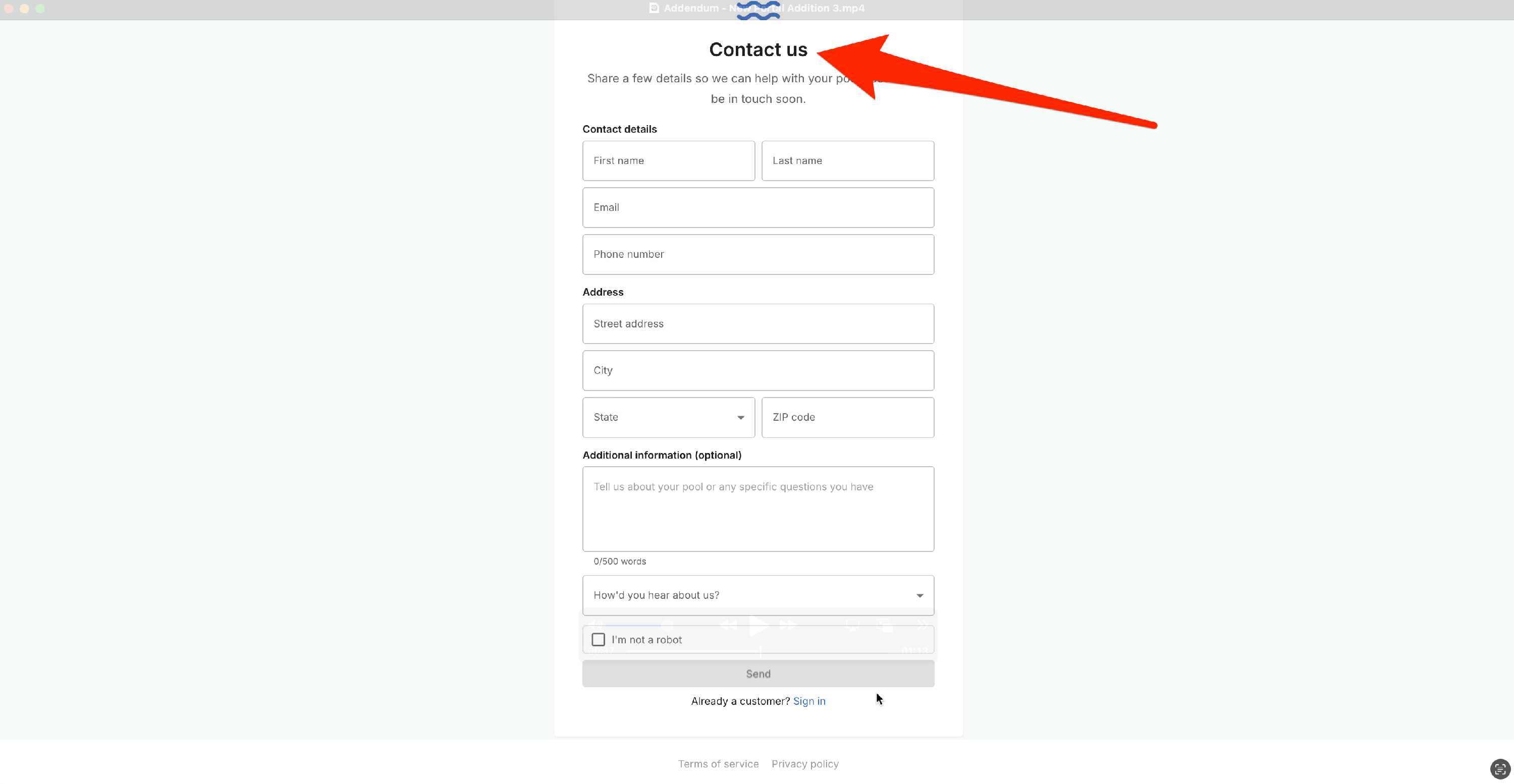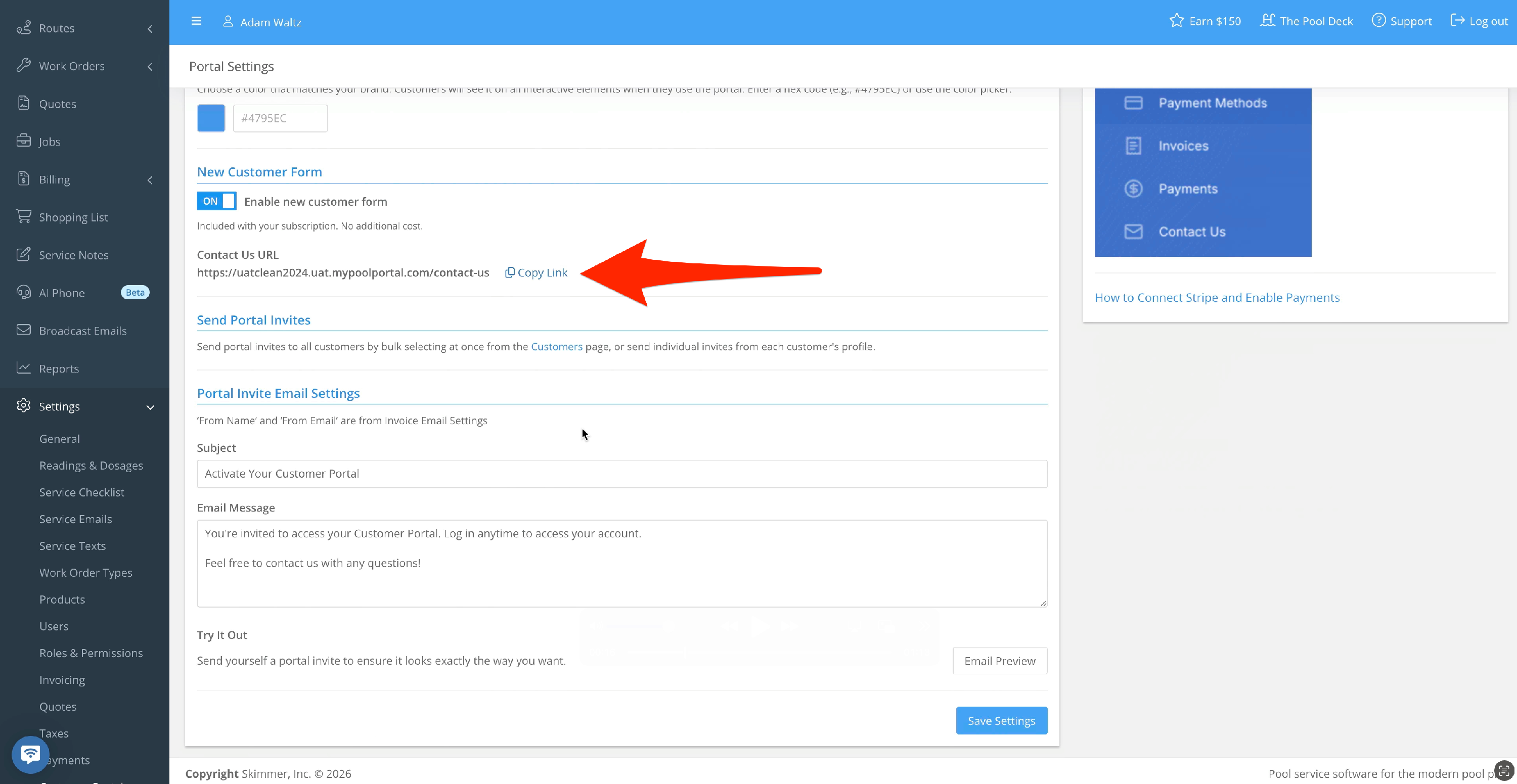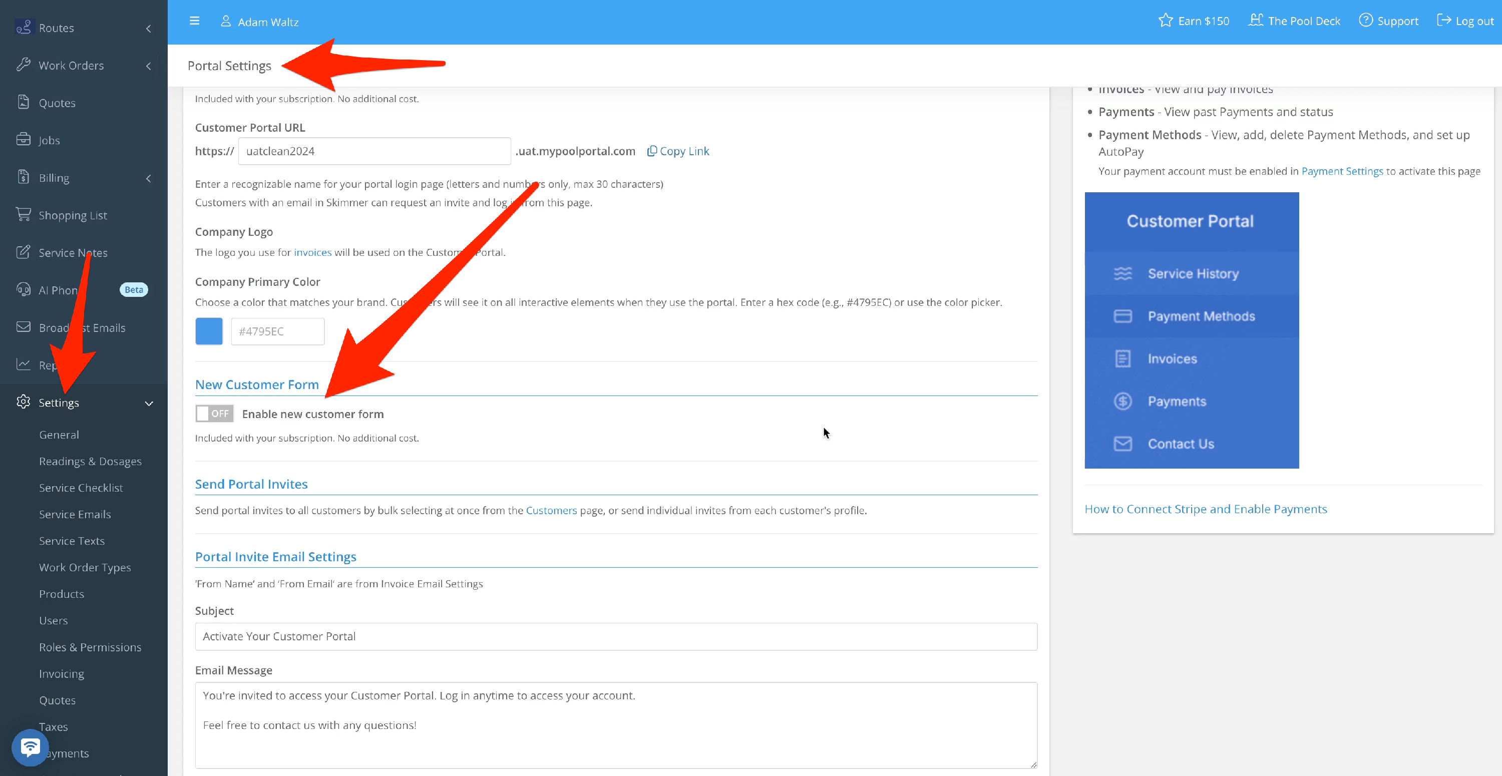 The new customer form that allows you to share a link with a potential customer. On the portal settings page, find the section called New Customer Form. Toggle the feature ON, and then make sure you click Save at the bottom to fully activate it.