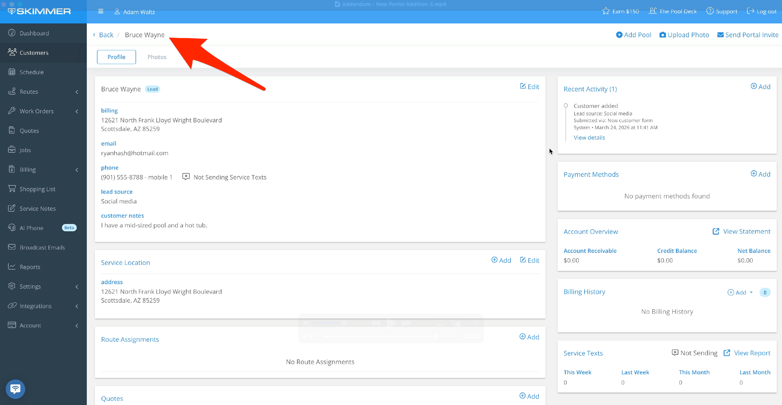 If the customer does not have the Send Invoices checkbox marked under their email, the Invoice tab will display this message: "Invoices are disabled. Ask your pool service provider about enabling billing features." To allow them to add payment details and view invoices, you can check the Send Invoices box in their customer profile.