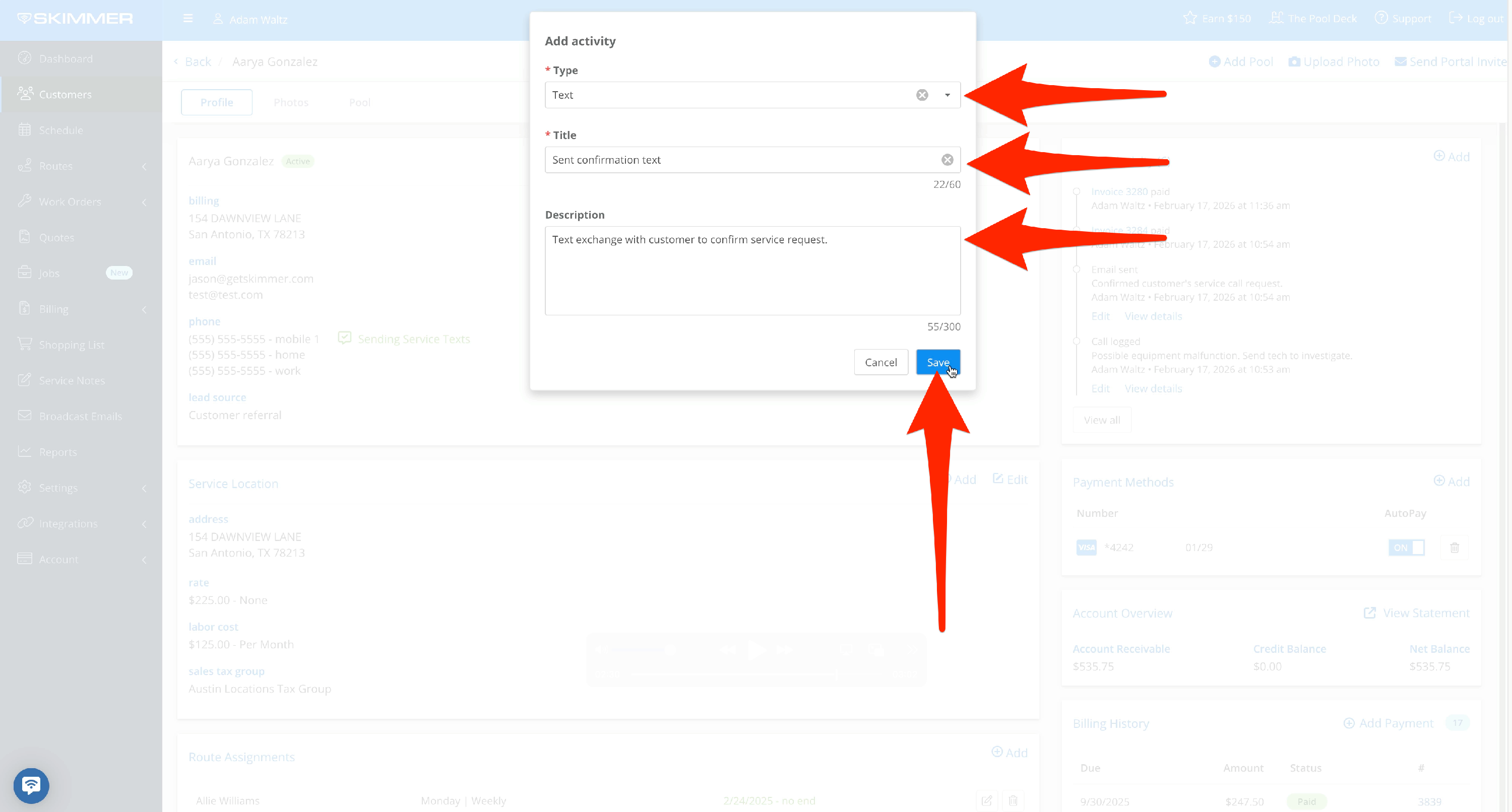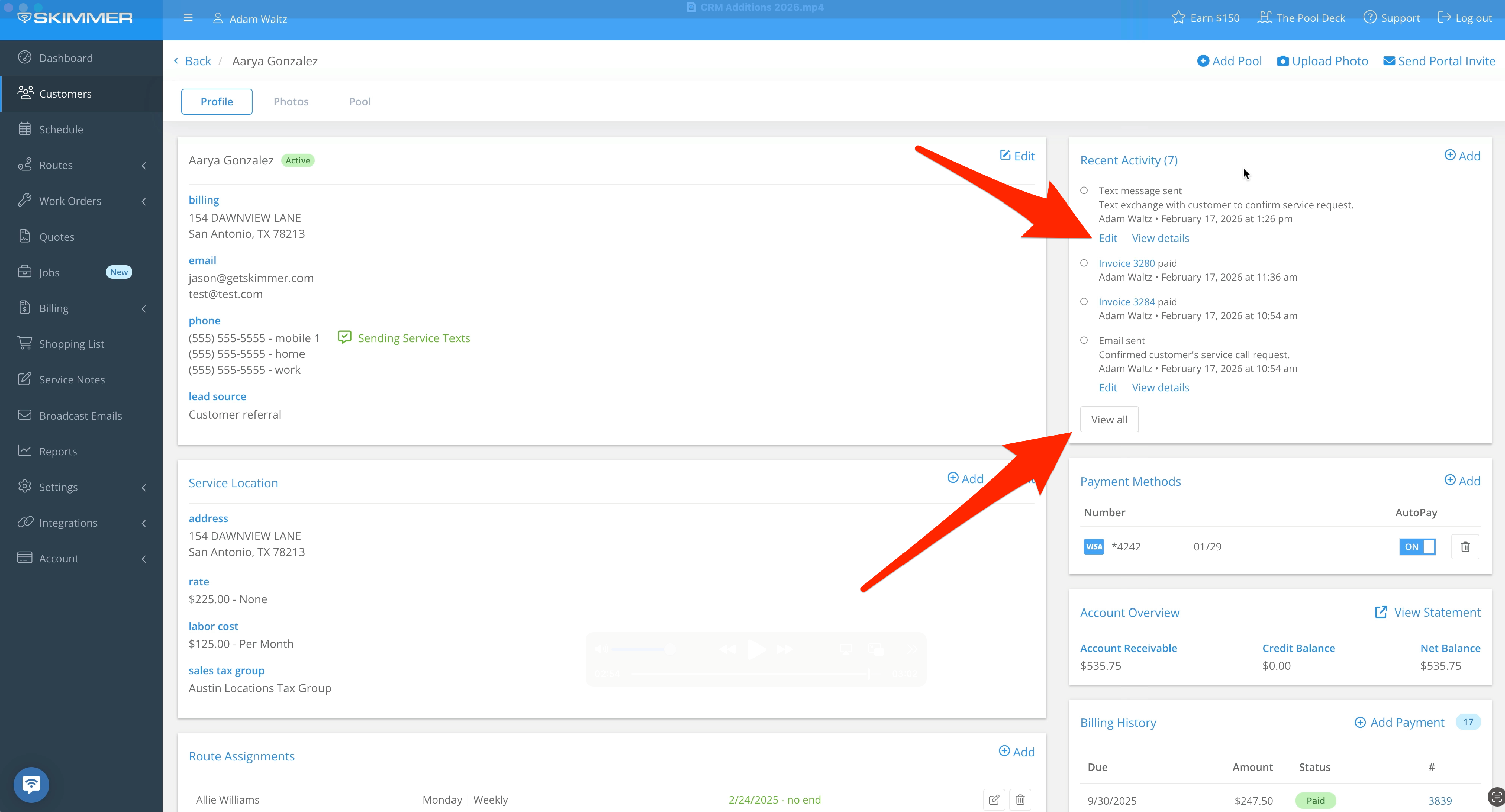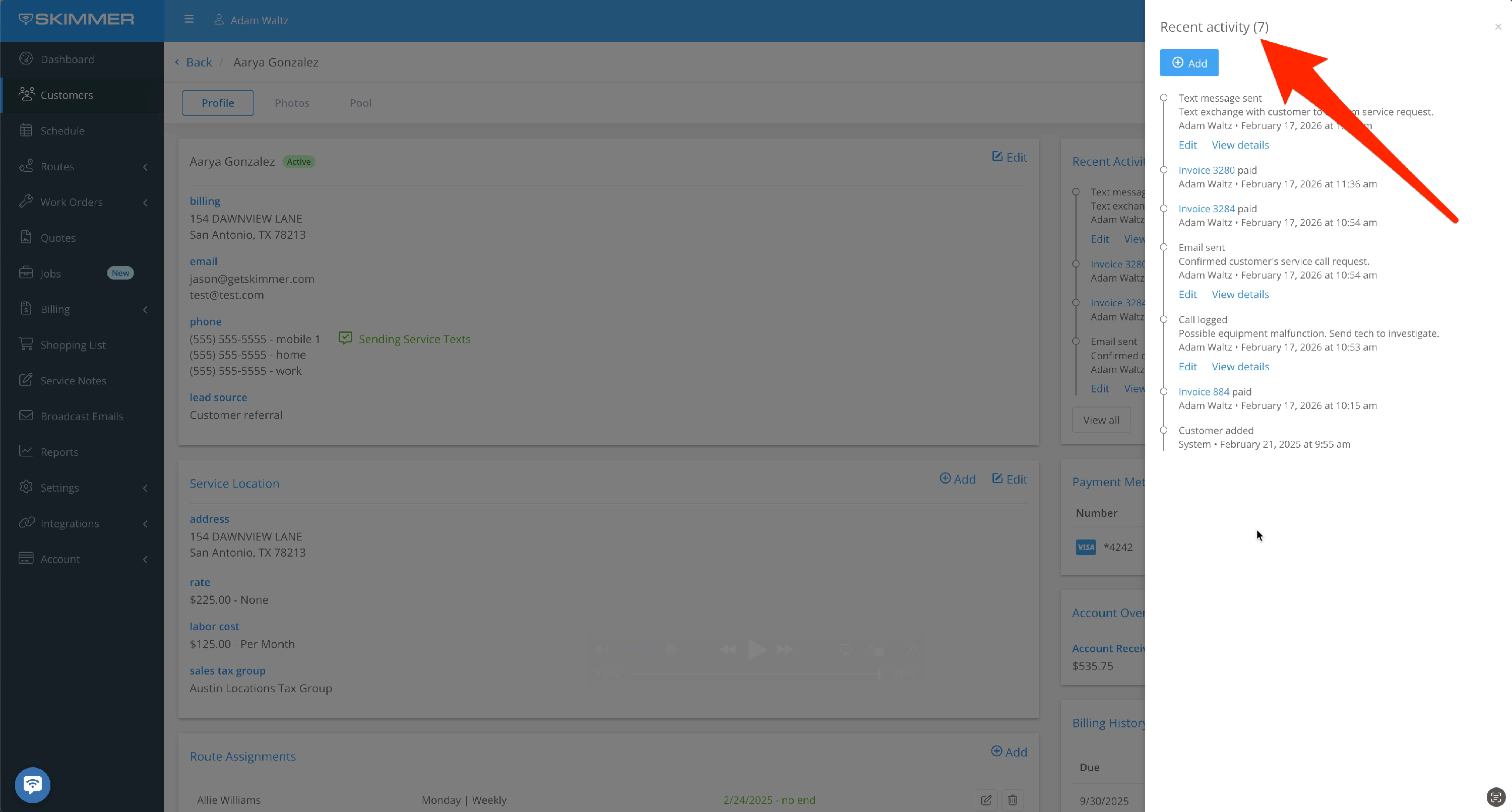 When a status changes, that will show in the Activity Log in the Recent Activity box. Currently, any user with View Customers permission can see it. Customer Activity is a chronological timeline of events for this customer account. Skimmer will automatically add certain events as they happen. For example, change of status, adding a payment method, enabling or disabling autopay, creating and sending invoices and receiving payment, all major quote milestones, suspension or reactivation.