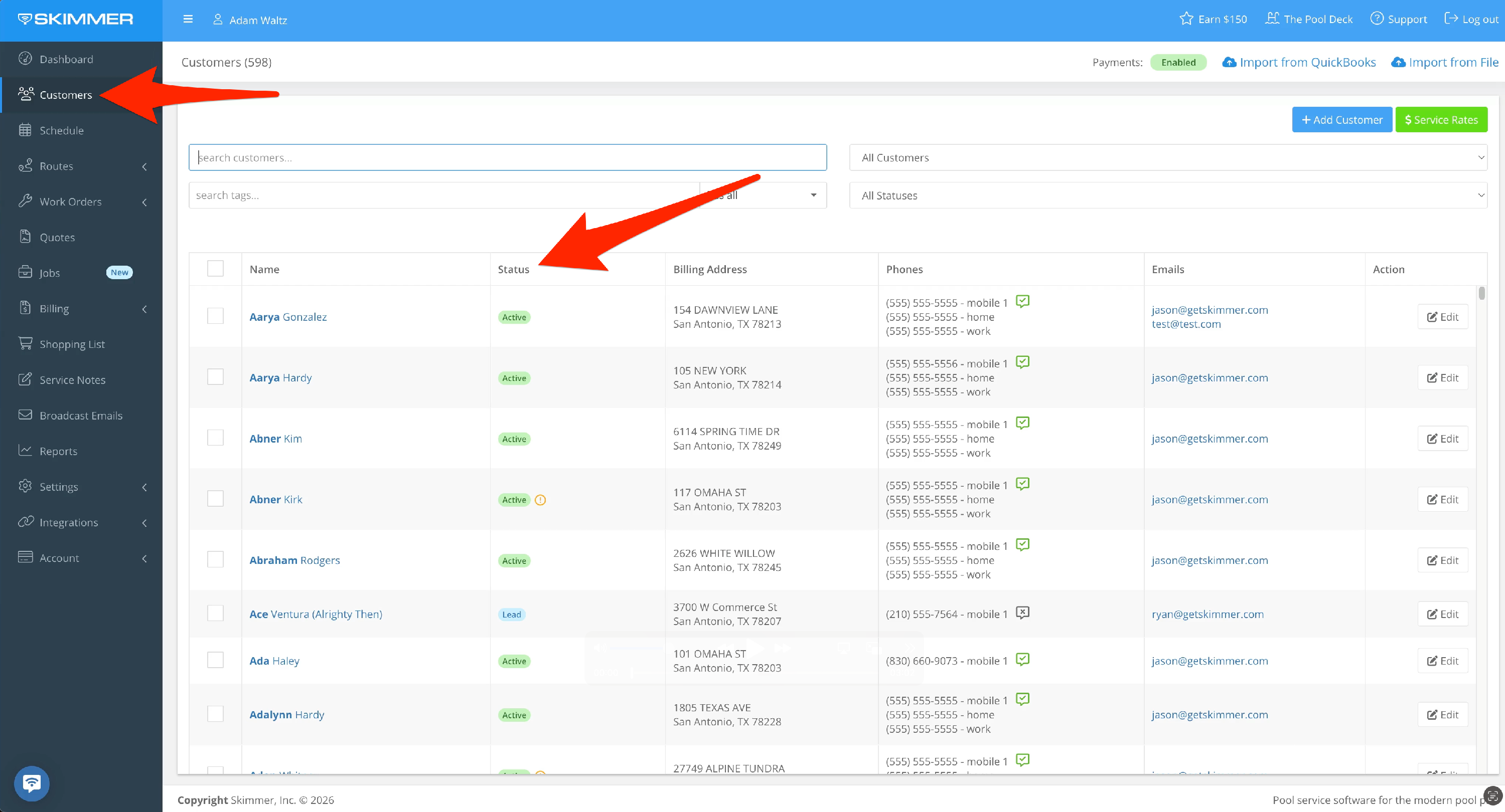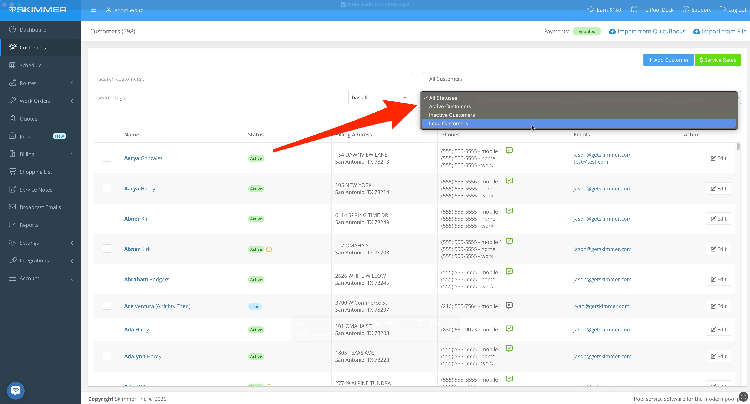 On the main Customers screen, there’s now a Status column, which will show whether a customer is Active or Inactive. The third possible status is Lead, which you can also filter for with the menu at the top. The Lead status helps identify and track potential customers before they become active. Any new customer you create will start with the Lead status. That status will change to Active if you assign them a route, convert their quote to a job, or manually change their status, which you can do in the top right corner of their profile edit screen.