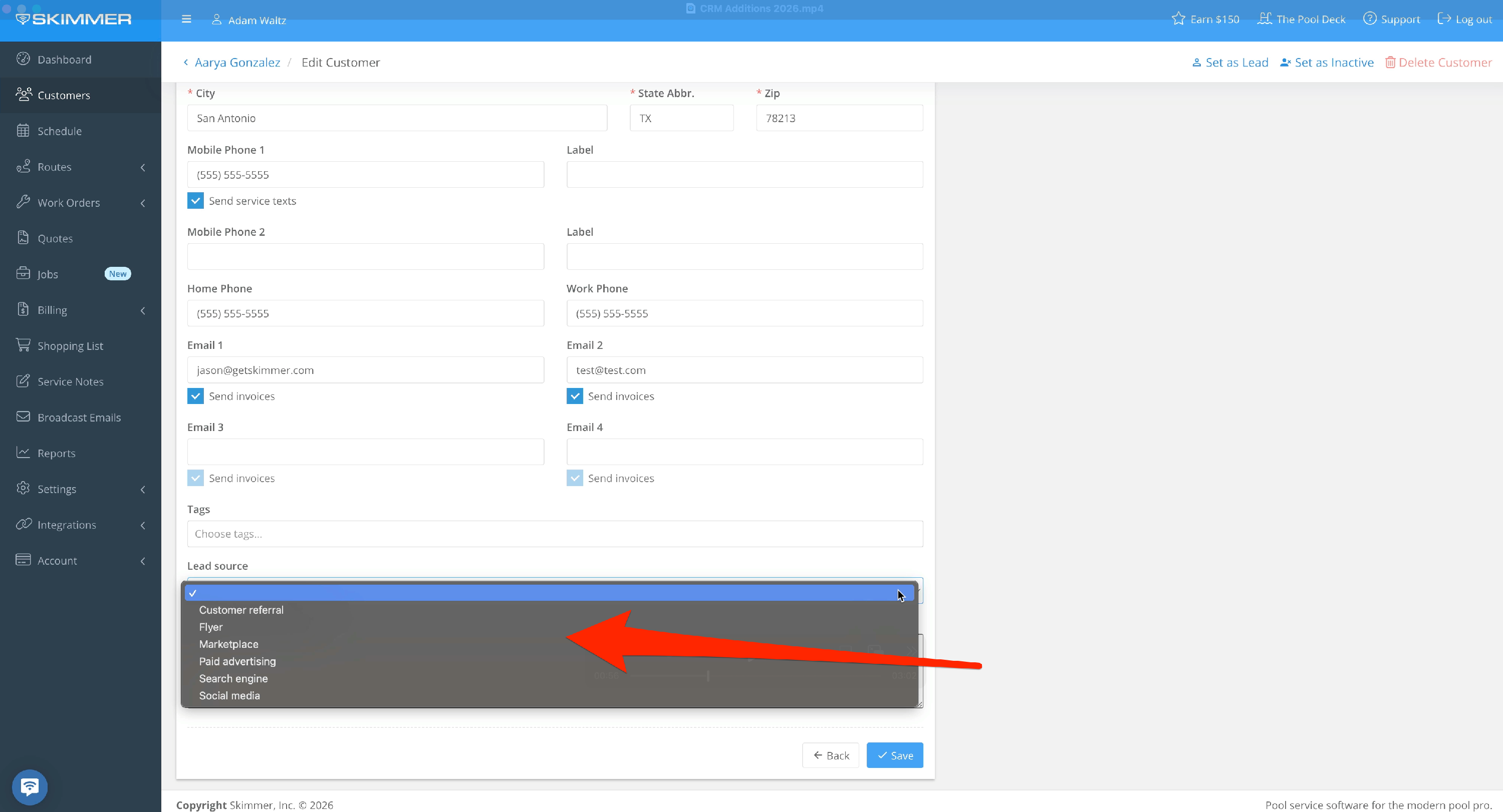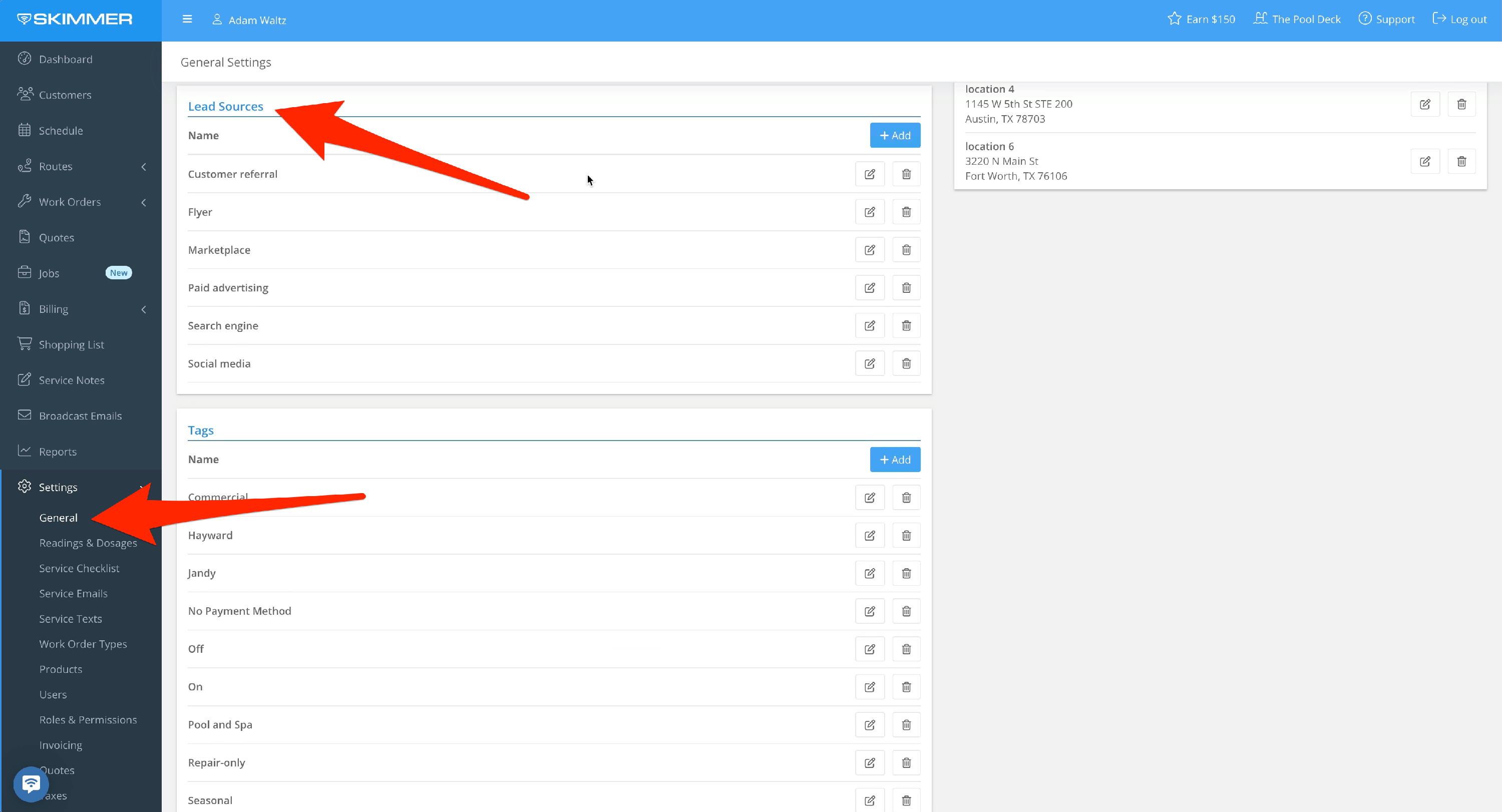 Click into a customer profile and select Edit, then scroll down to the Lead Source menu. There are default lead sources, but under Settings > General > Lead Sources, you can edit this list to reflect the sources that best fit your business. Each source must have a unique name, and a Skimmer user’s ability to see this list will depend on the access you’ve granted their account. If you delete a lead source, it will remove the association from any customer assigned that lead source, and this action cannot be undone. Currently, you can have up to ten lead sources.