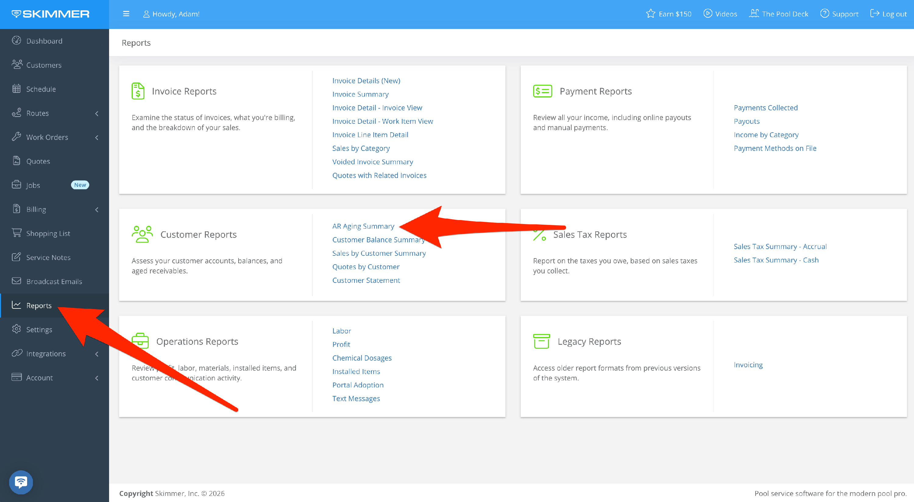 NOTE: This report is now in a new location, as indicated by the screenshot below. Disregard the previous location under Billing, as reflected in subsequent screenshots. Going forward, the AR AGing Summary Report can be found under Reports in the main menu.