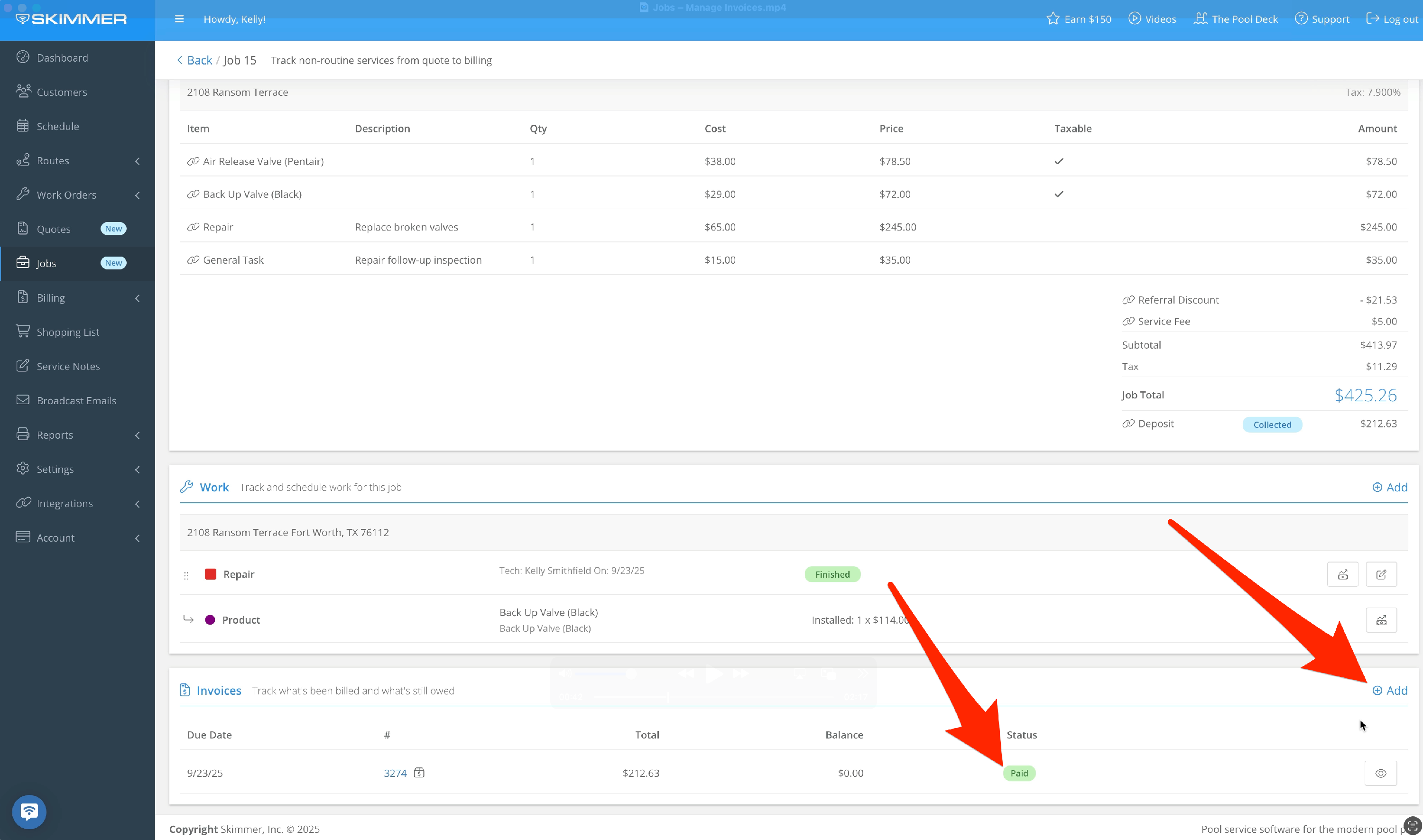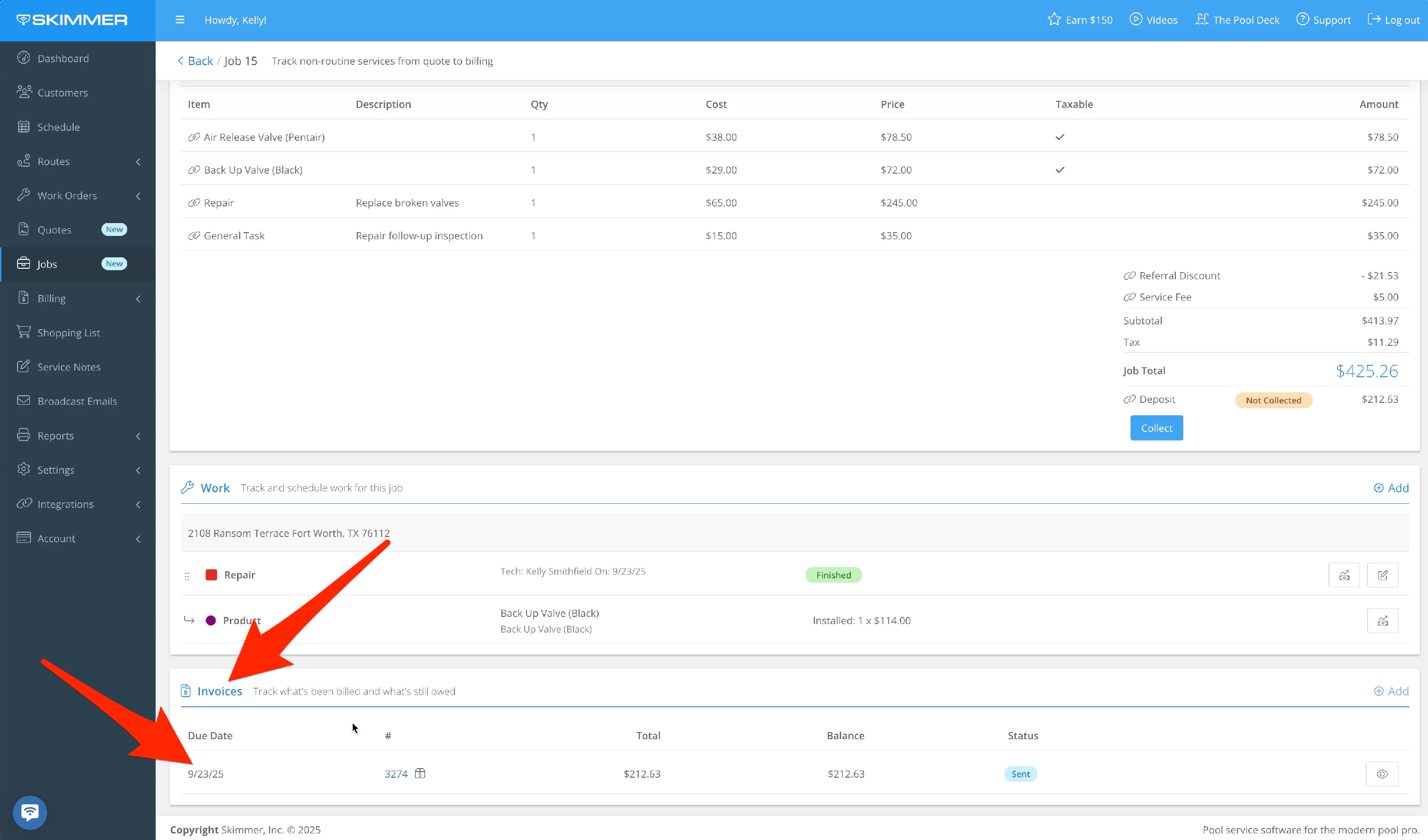 It will also show the invoice to collect a deposit, was required. When the deposit is collected, it will automatically be deducted from the next invoice for this job. However, you can use the trash icon on the invoice to remove the collected deposit. This defers applying the deposit and the deduction will show again the next time this job is invoiced.