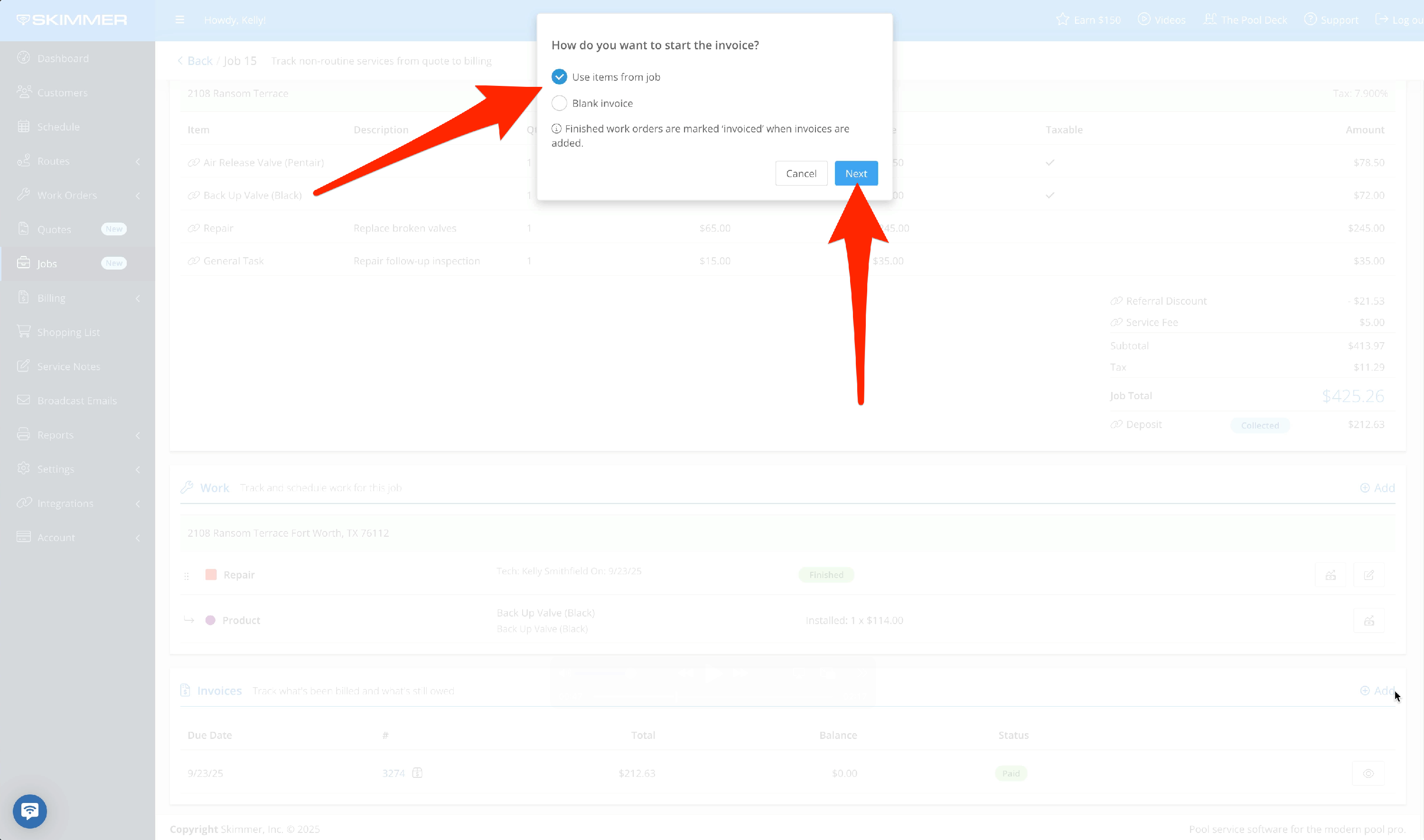Now that the deposit is paid, we can add another invoice. If you create one from scratch, you’ll be taken to the standard “create new invoice” screen. If you create an invoice from Job line items, it will auto-populate with line items. You have the option to edit, add new, or delete any line items.