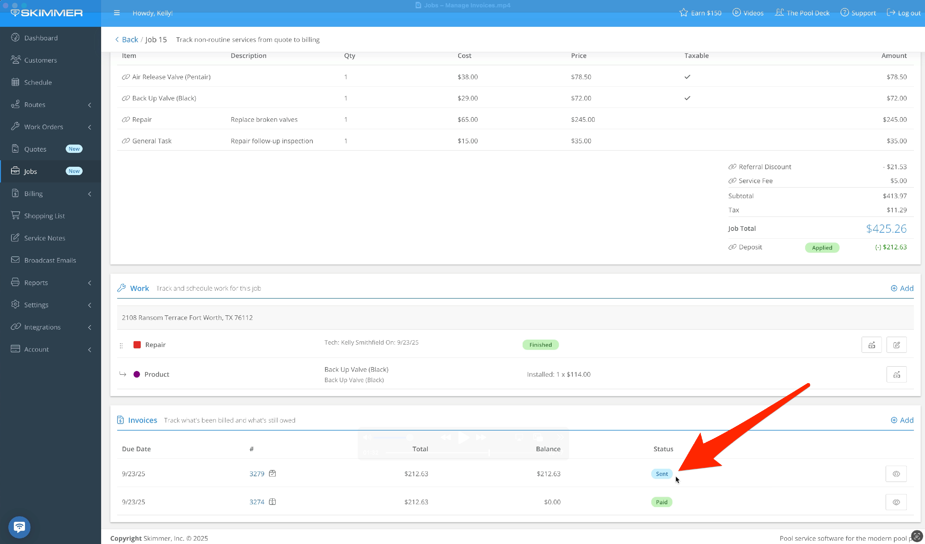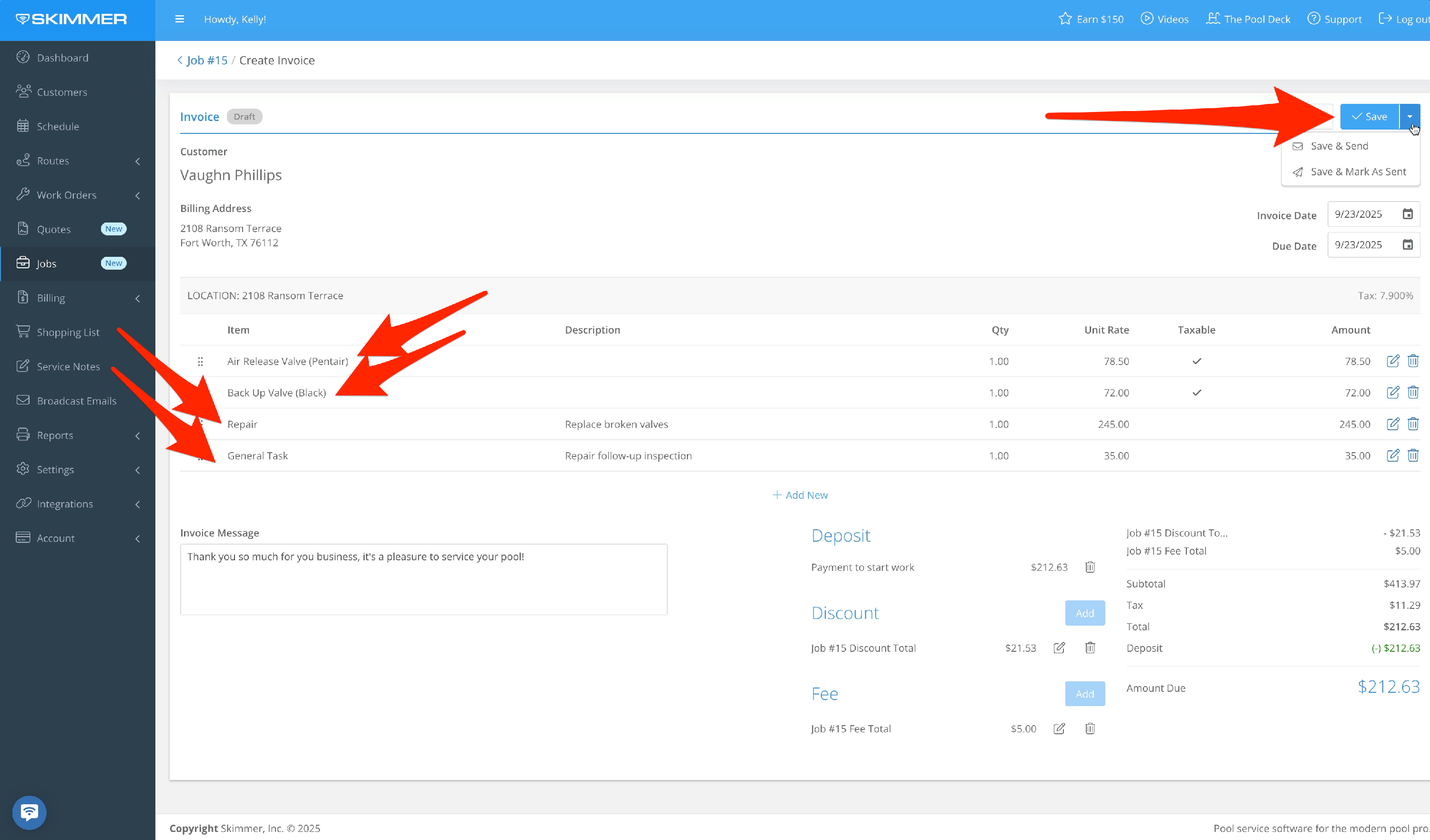Once the invoice is ready, you can save it, save and send it to the customer, or save and mark it as sent. Skimmer will continue tracking the status of the invoice, and that will reflect in the Invoices box.