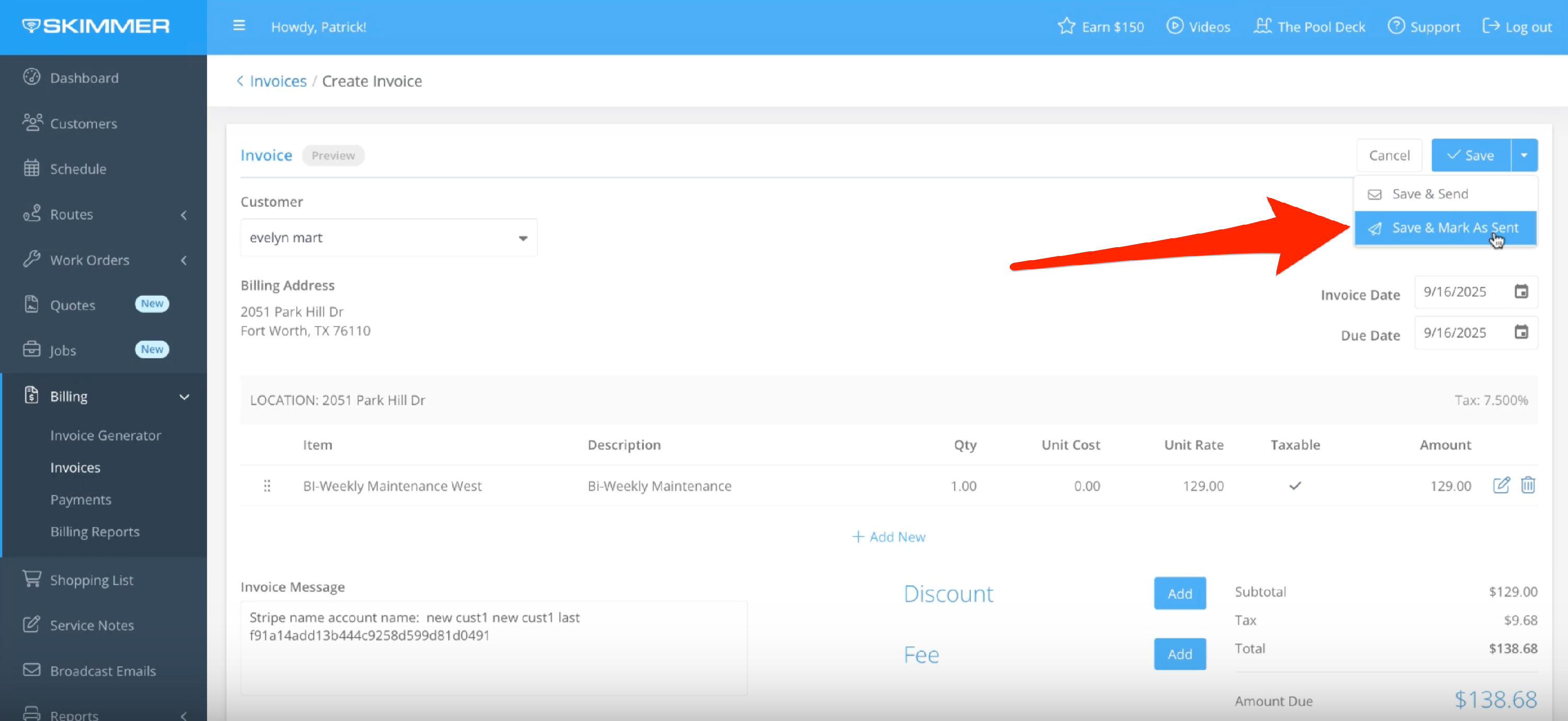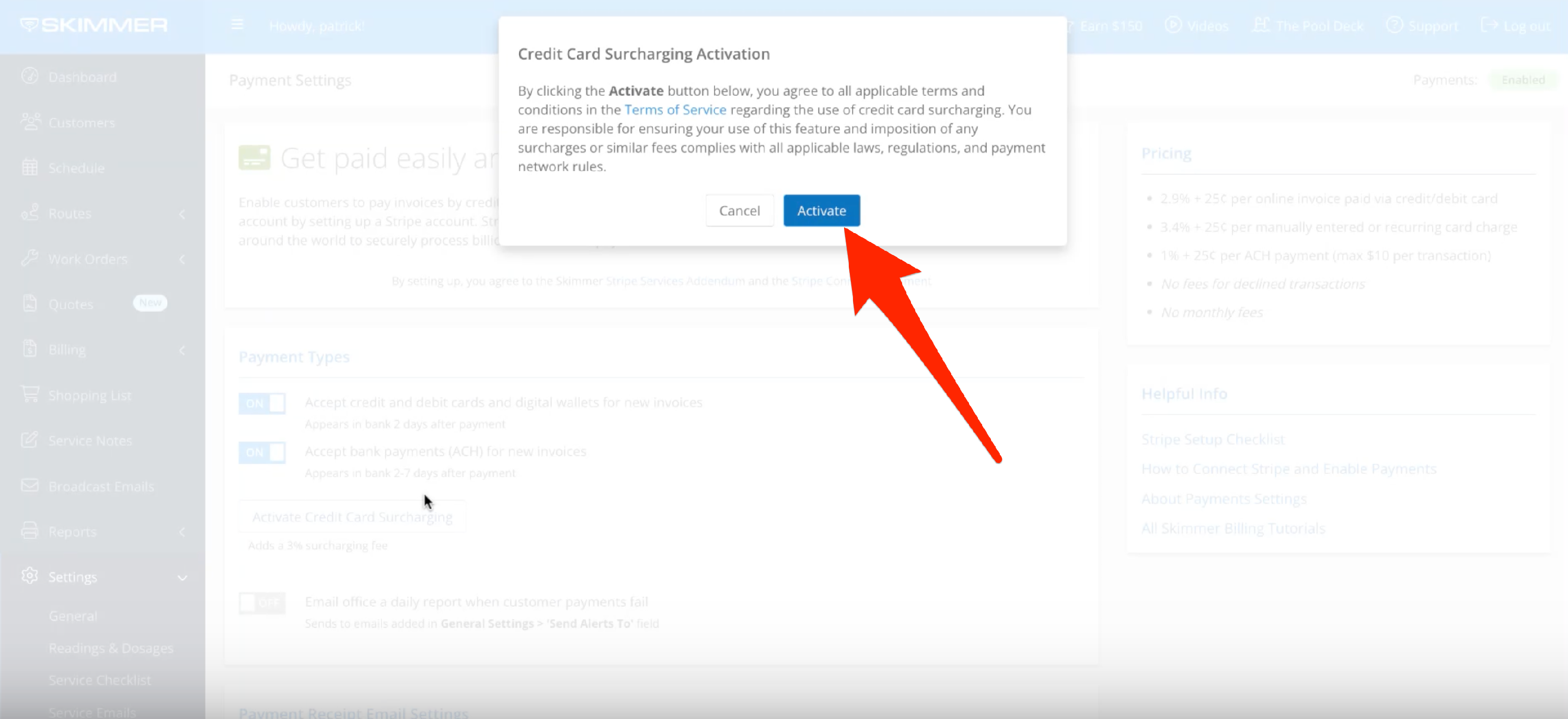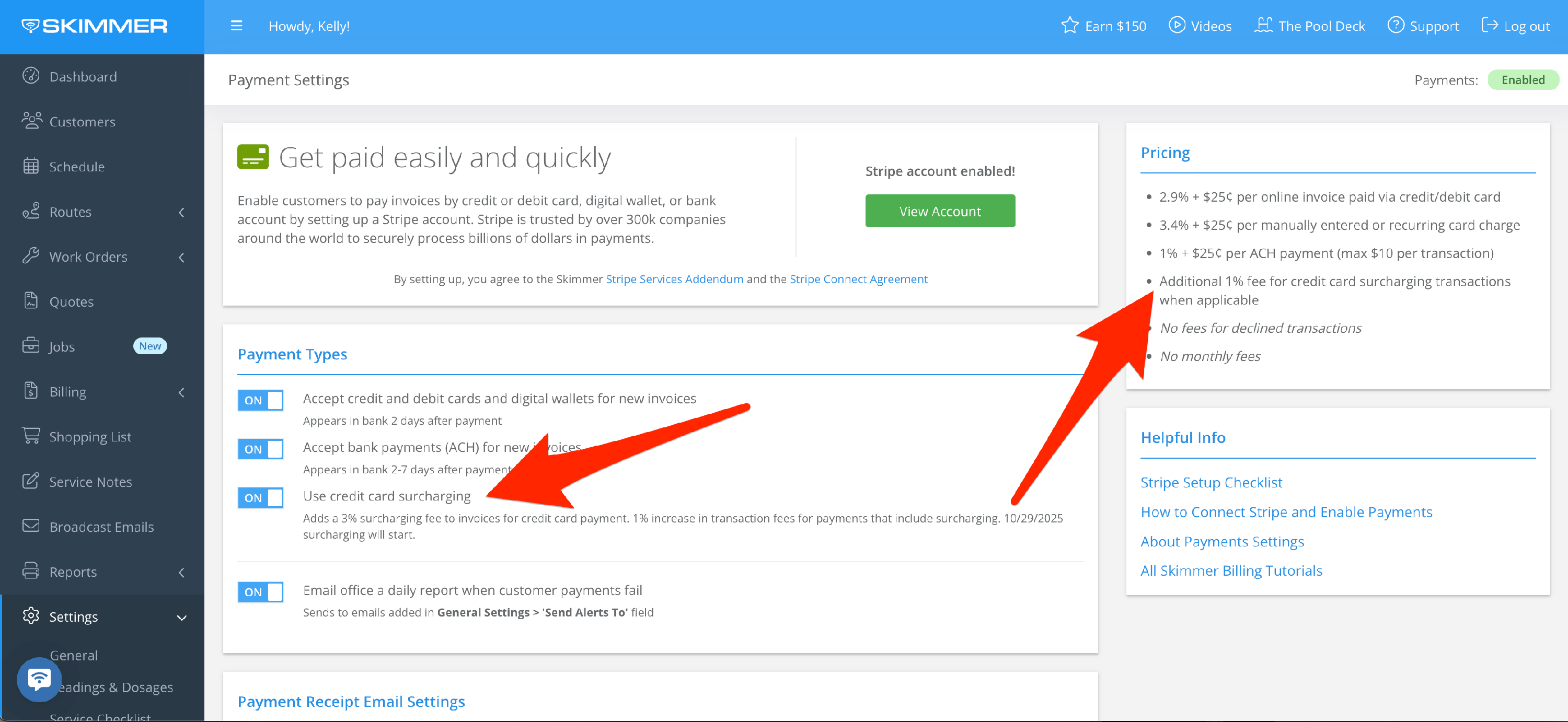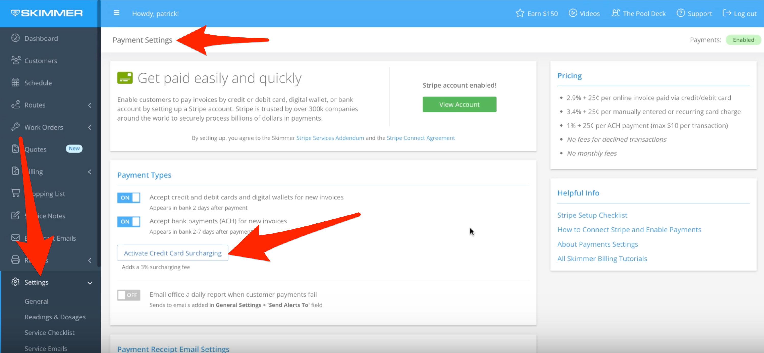 When you bill through Skimmer, you can set up an automatic surcharge for credit card payments. On the website, go to Settings and then Payments. Once there, you’ll see a button that says Activate Credit Card Surcharging.