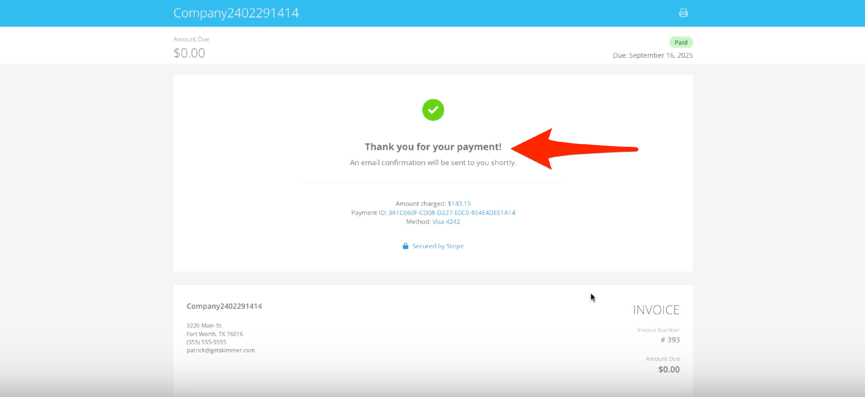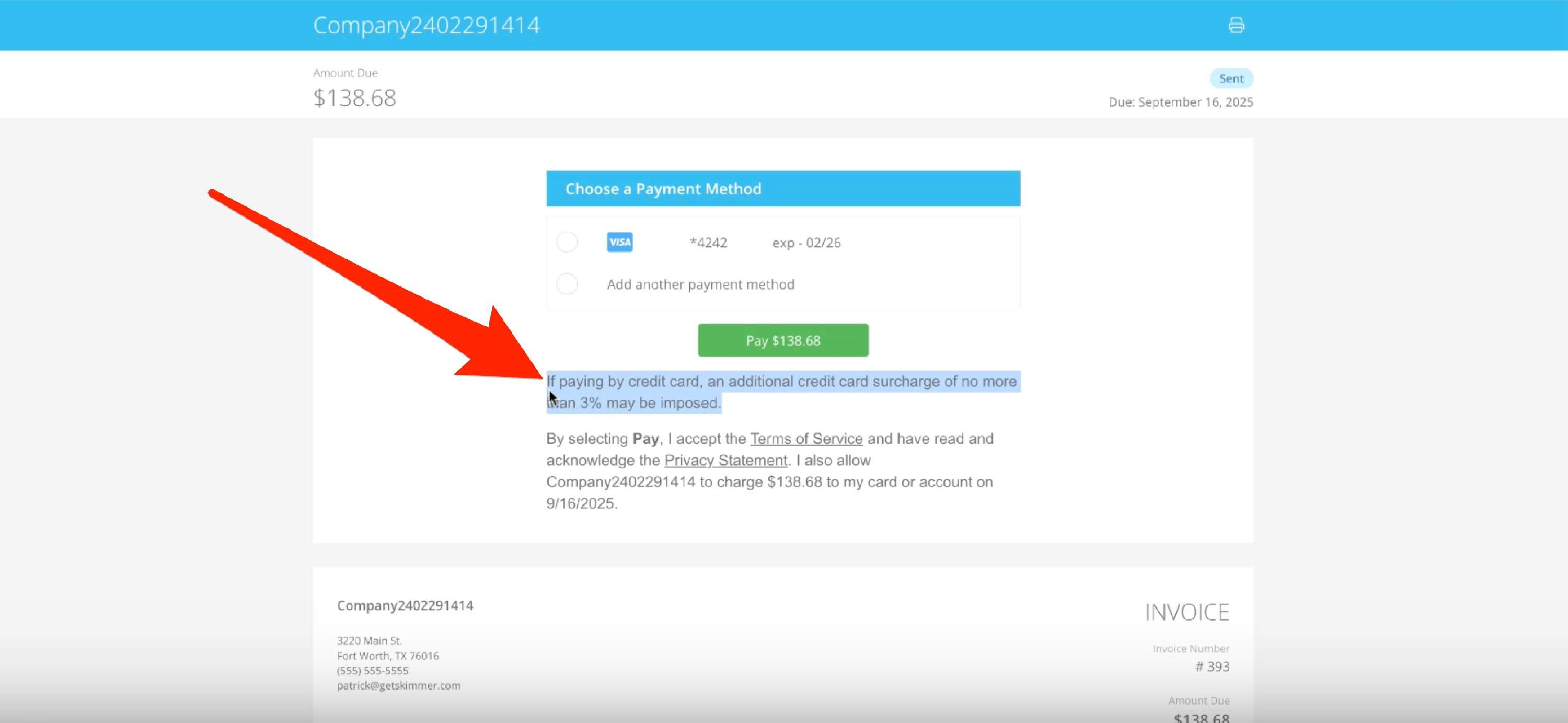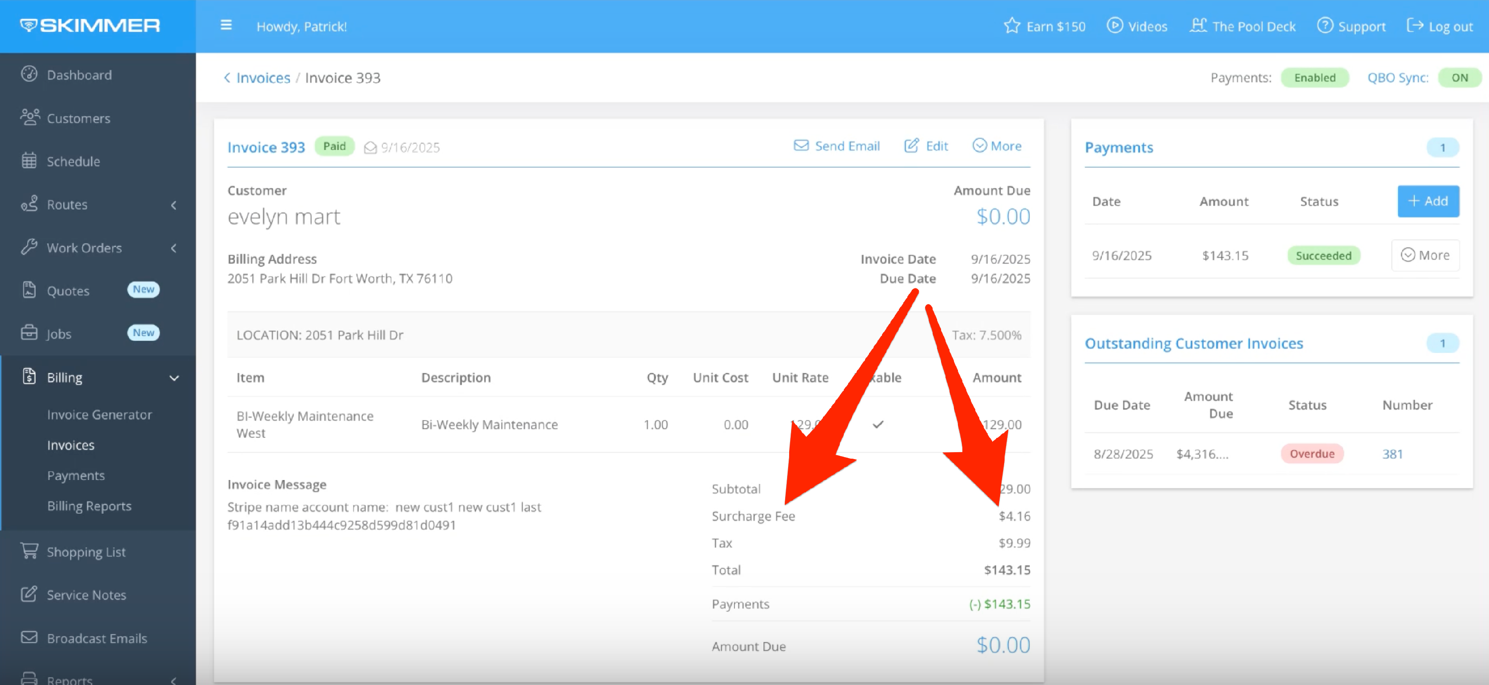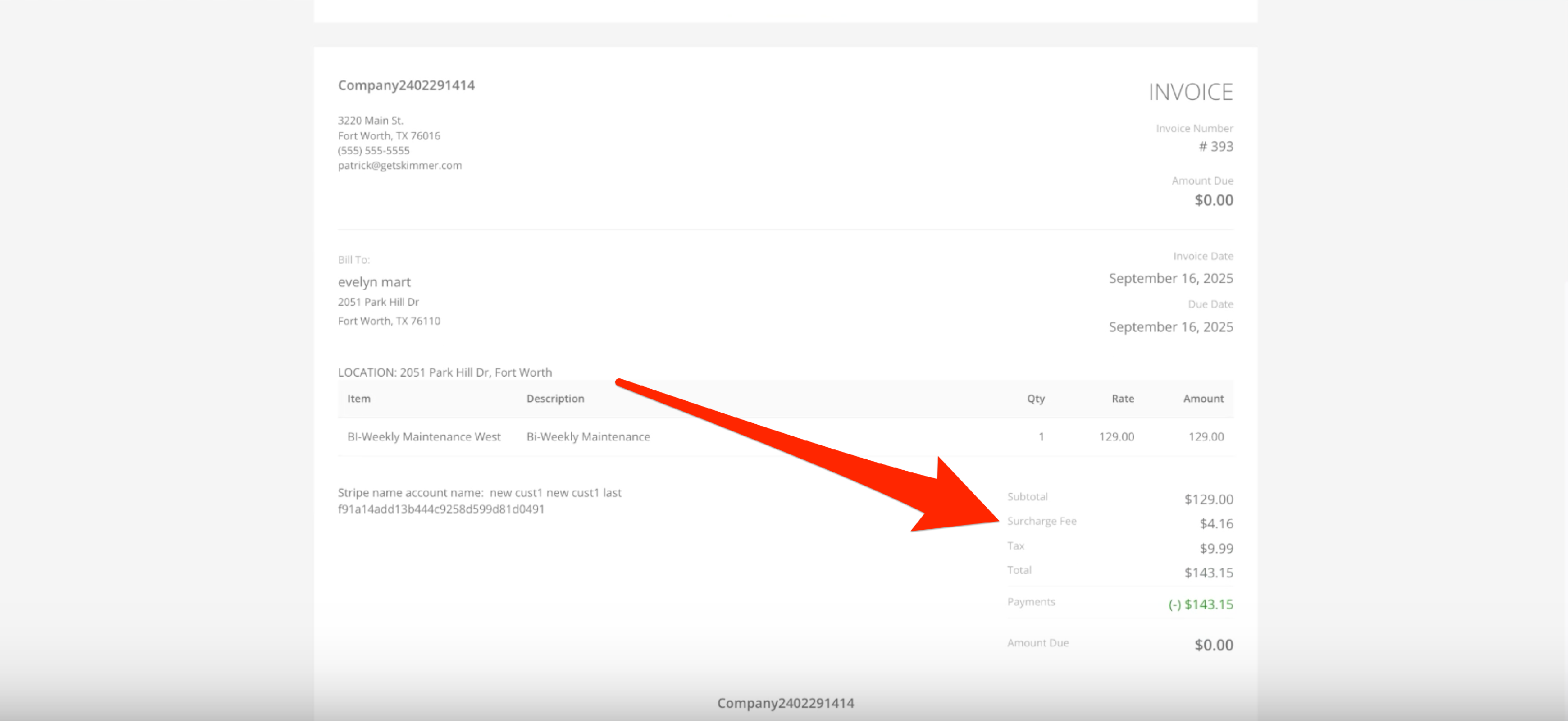 That’s all you need to do to set up surcharging. The system will add the surcharge for credit cards, whether its auto-paid or submitted manually. So, when you create and send an invoice, the customer will see a disclaimer letting them know a surcharge will be applied if they pay with a credit card. They also have the option of adding a new payment method. Once they submit payment, their invoice will update to reflect the surcharge. You’ll also be able to see it in Skimmer when you view the invoice.