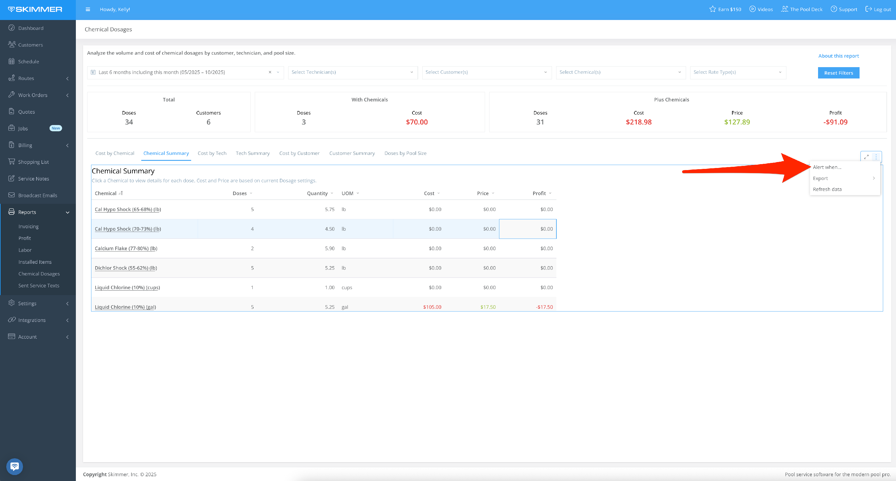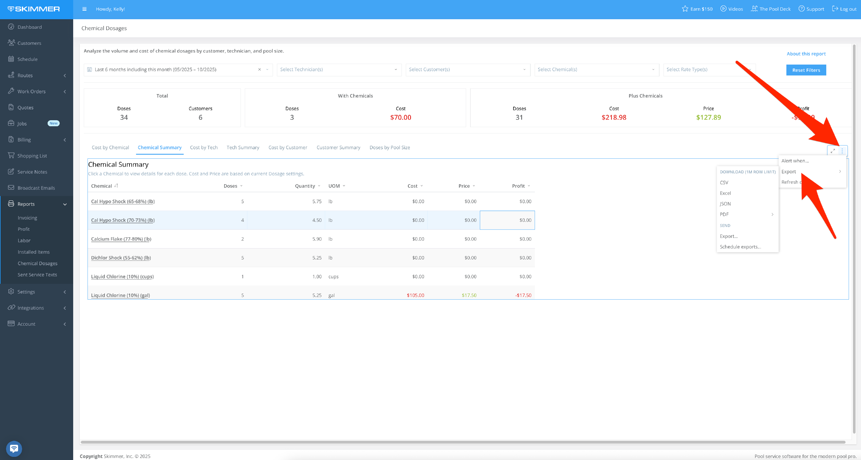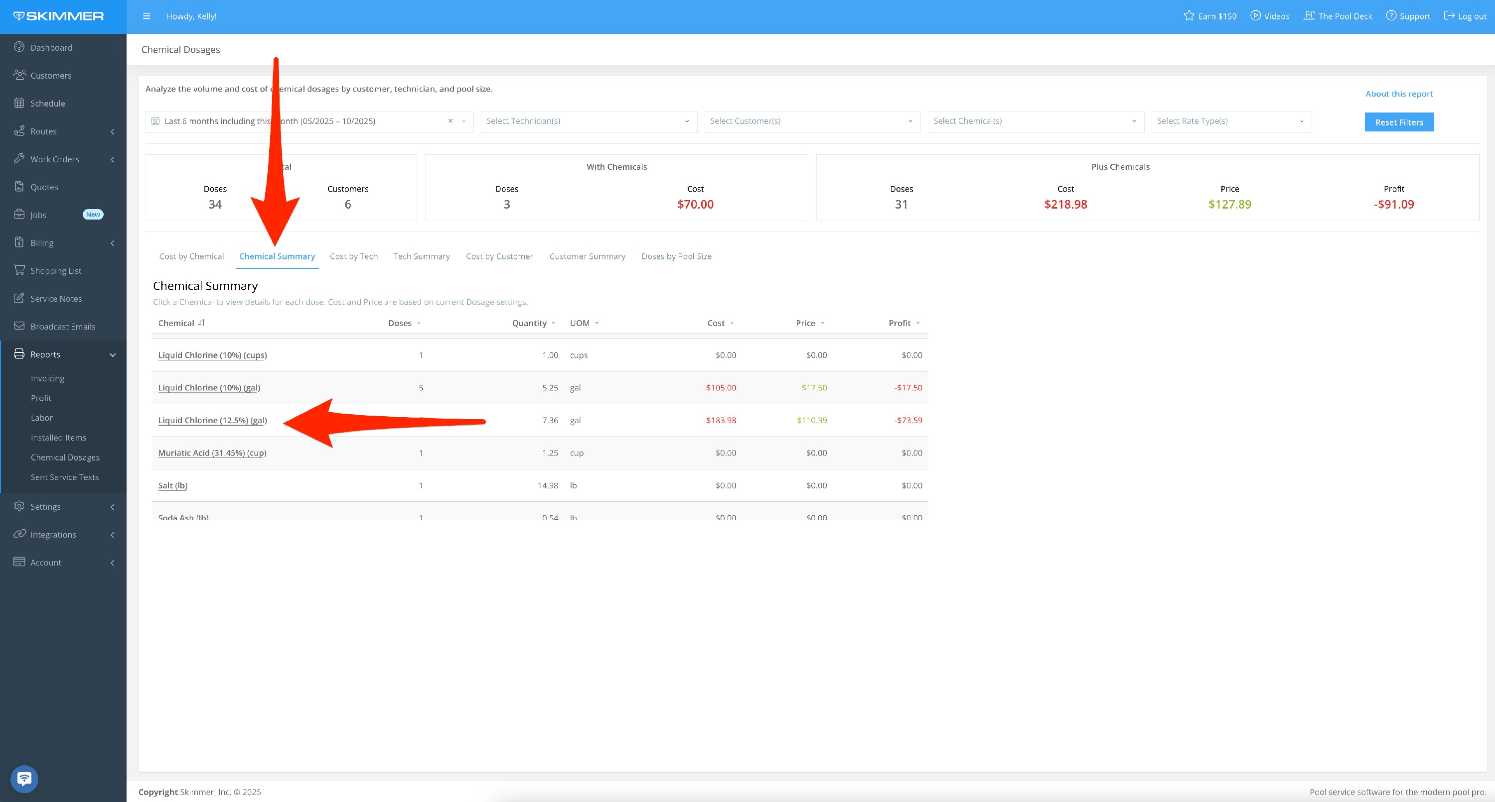 - Chemical Summary shows all chemicals administered to pools during a set date range. You can see how many times a chemical was added to a pool, the total quantity administered, and associated cost, and profit.