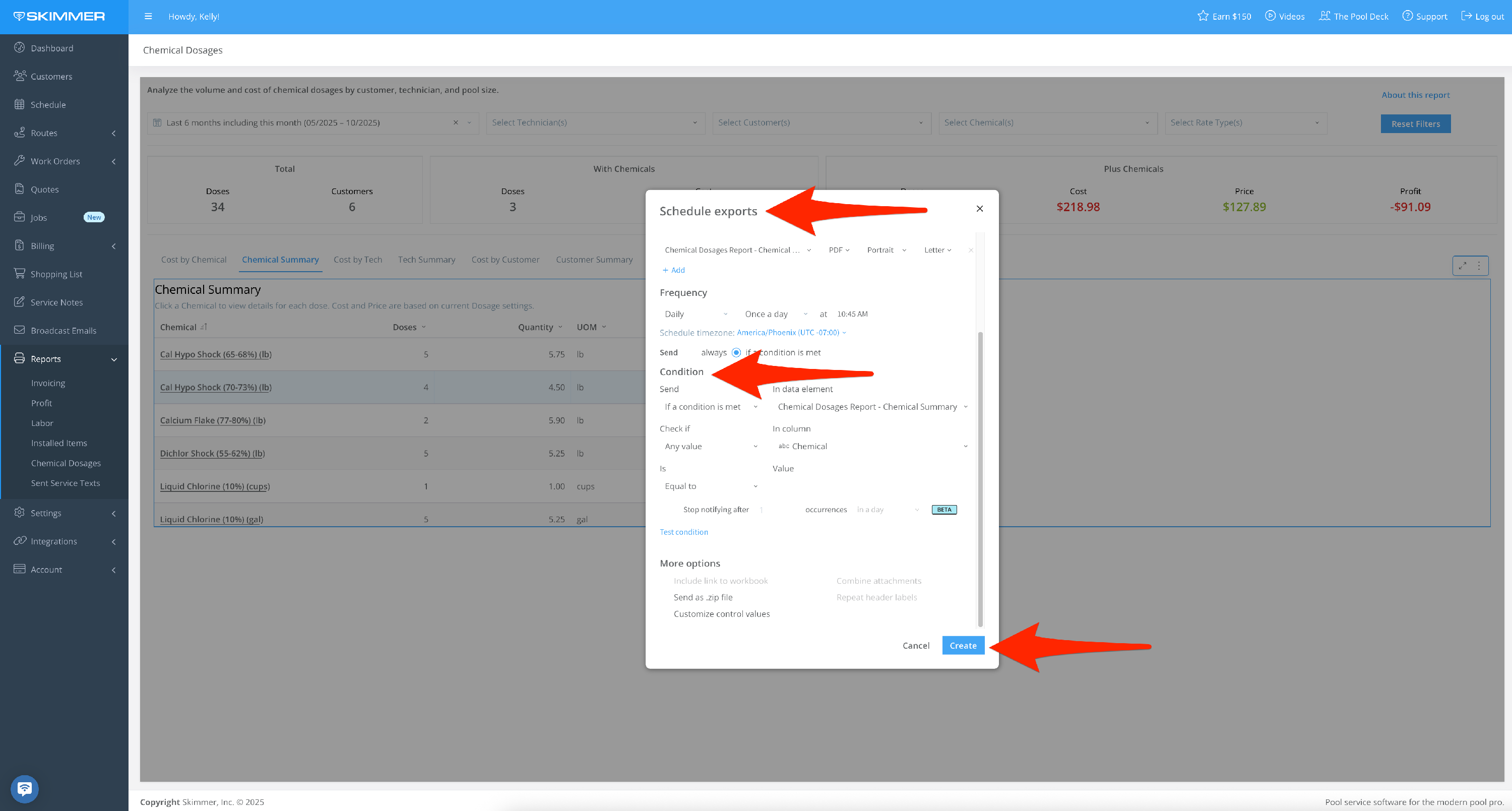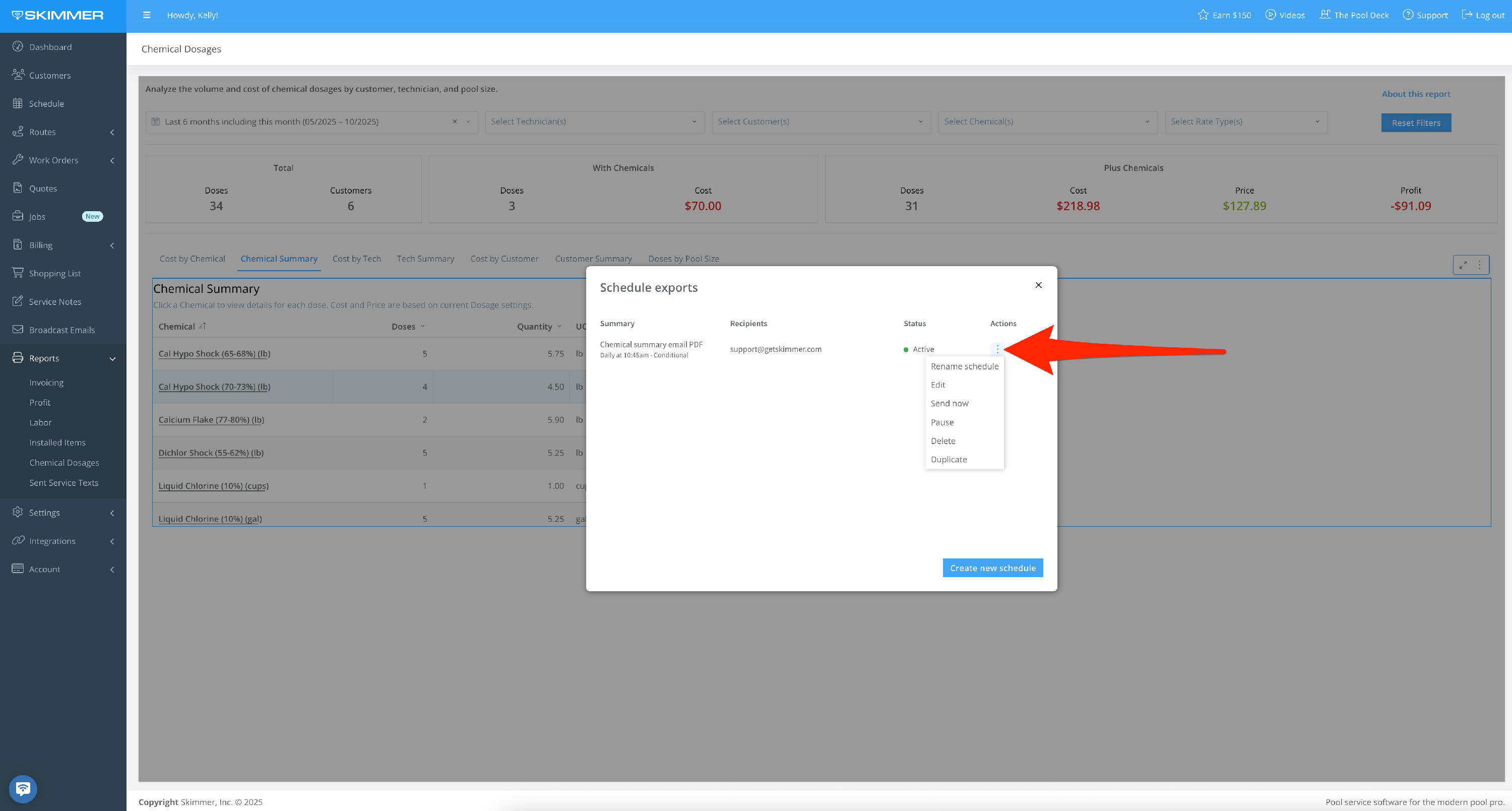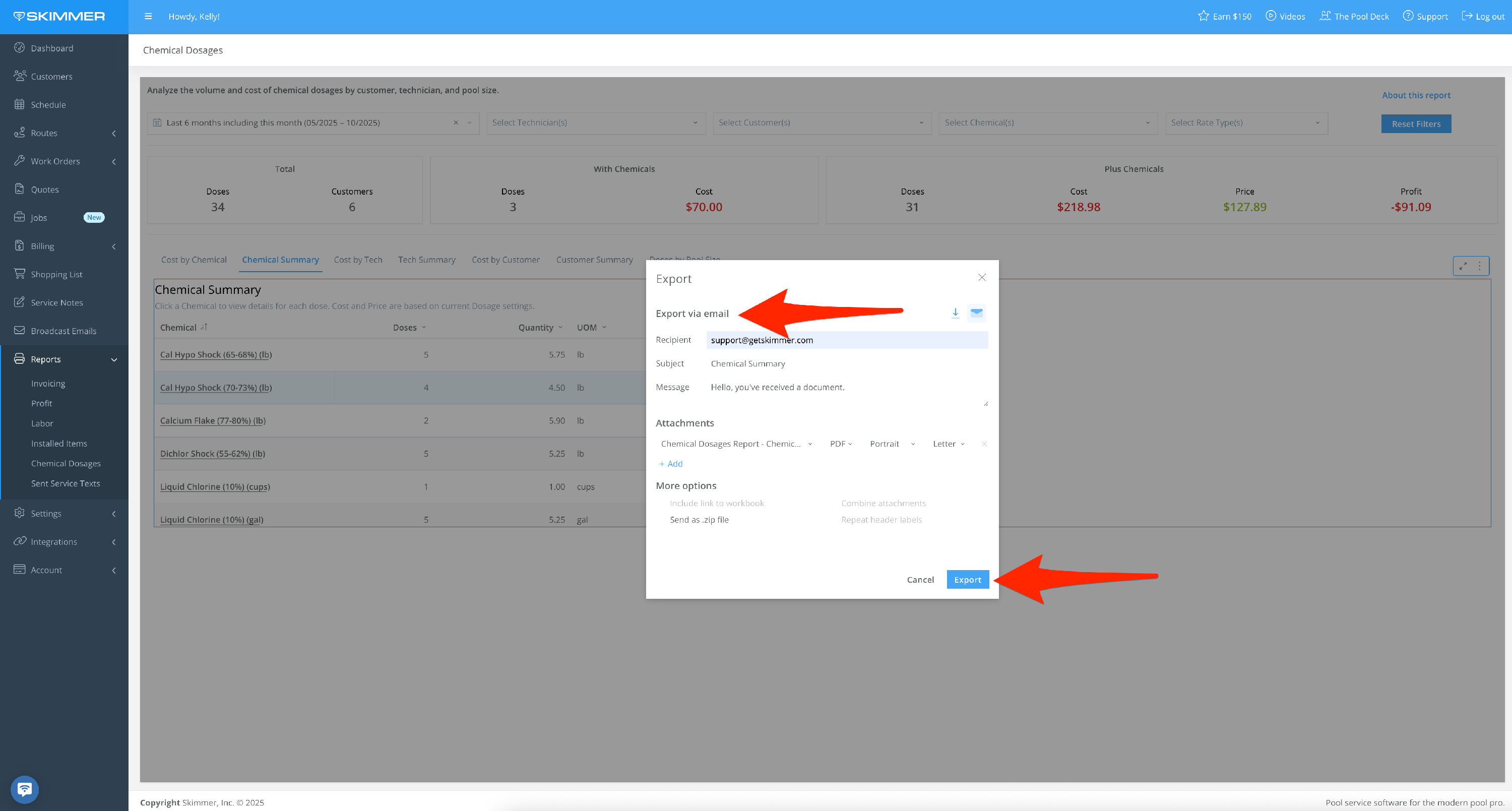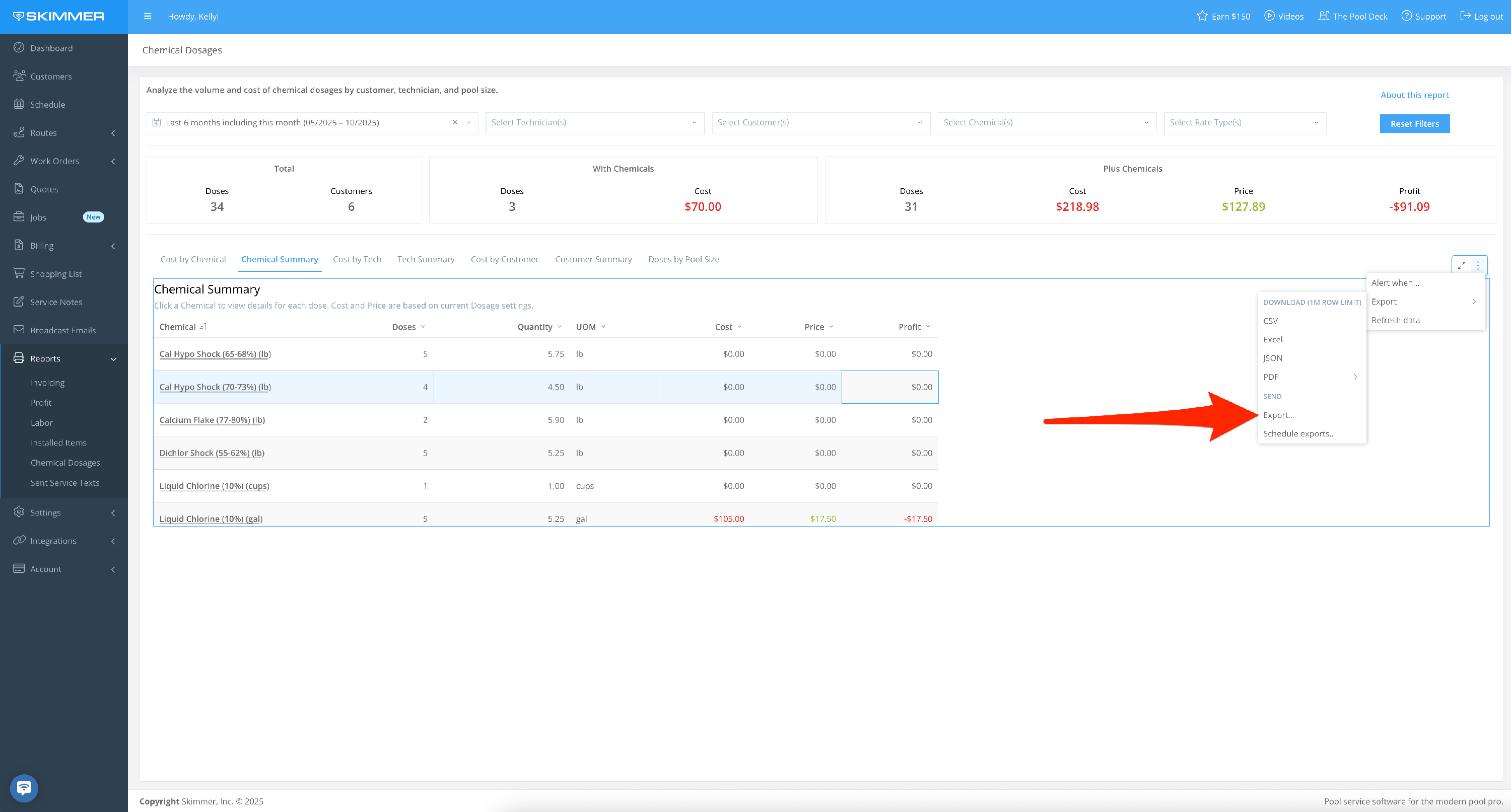 - Chemical Summary shows all chemicals administered to pools during a set date range. You can see how many times a chemical was added to a pool, the total quantity administered, and associated cost, and profit.