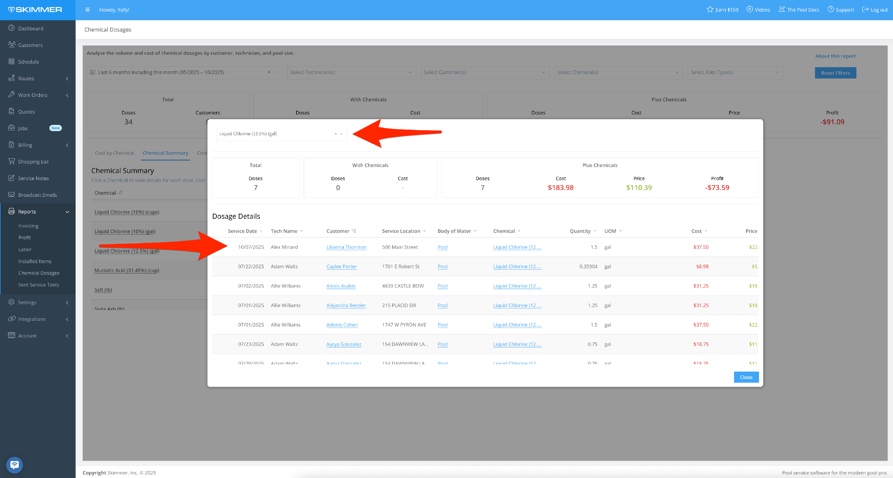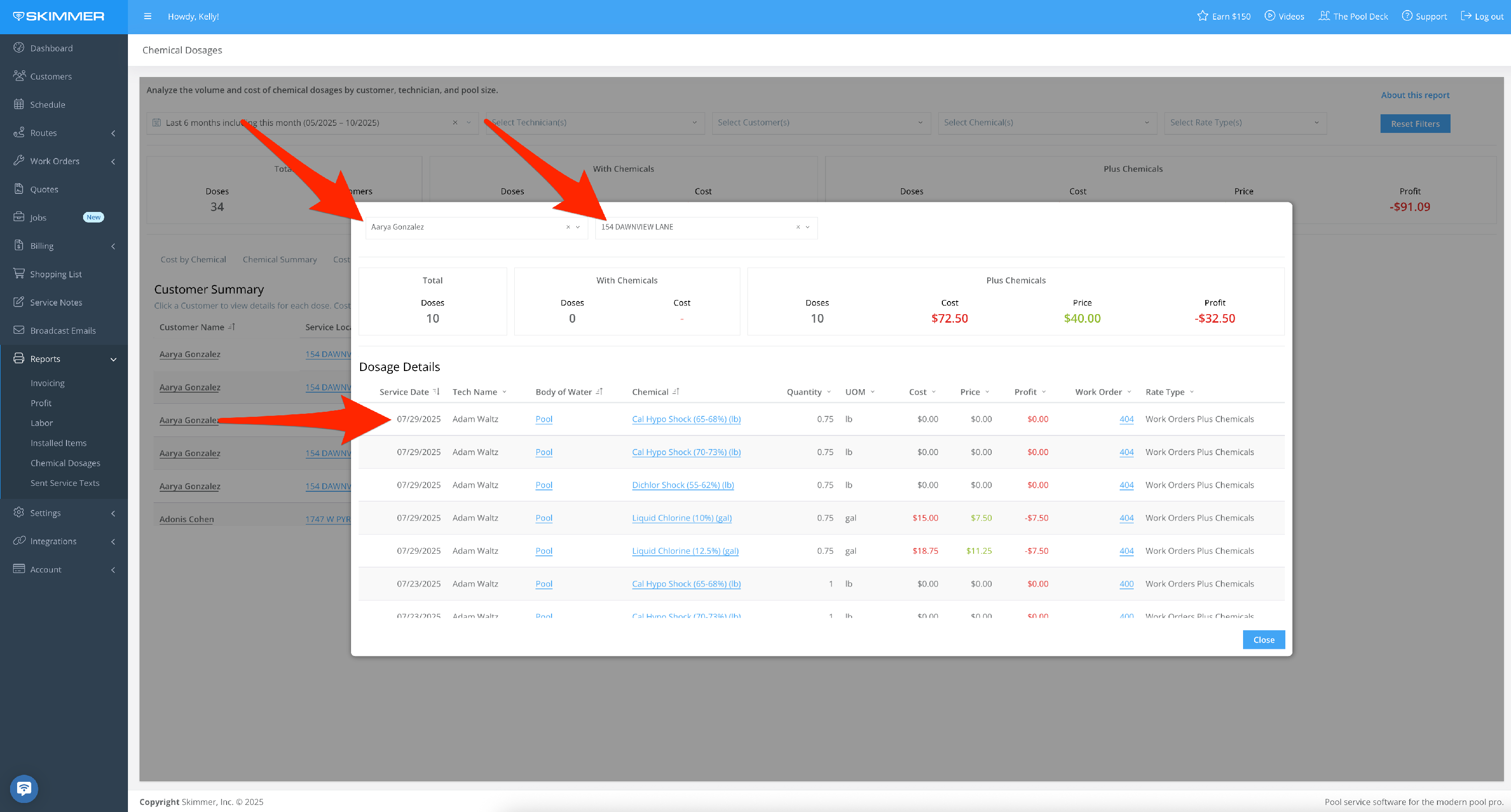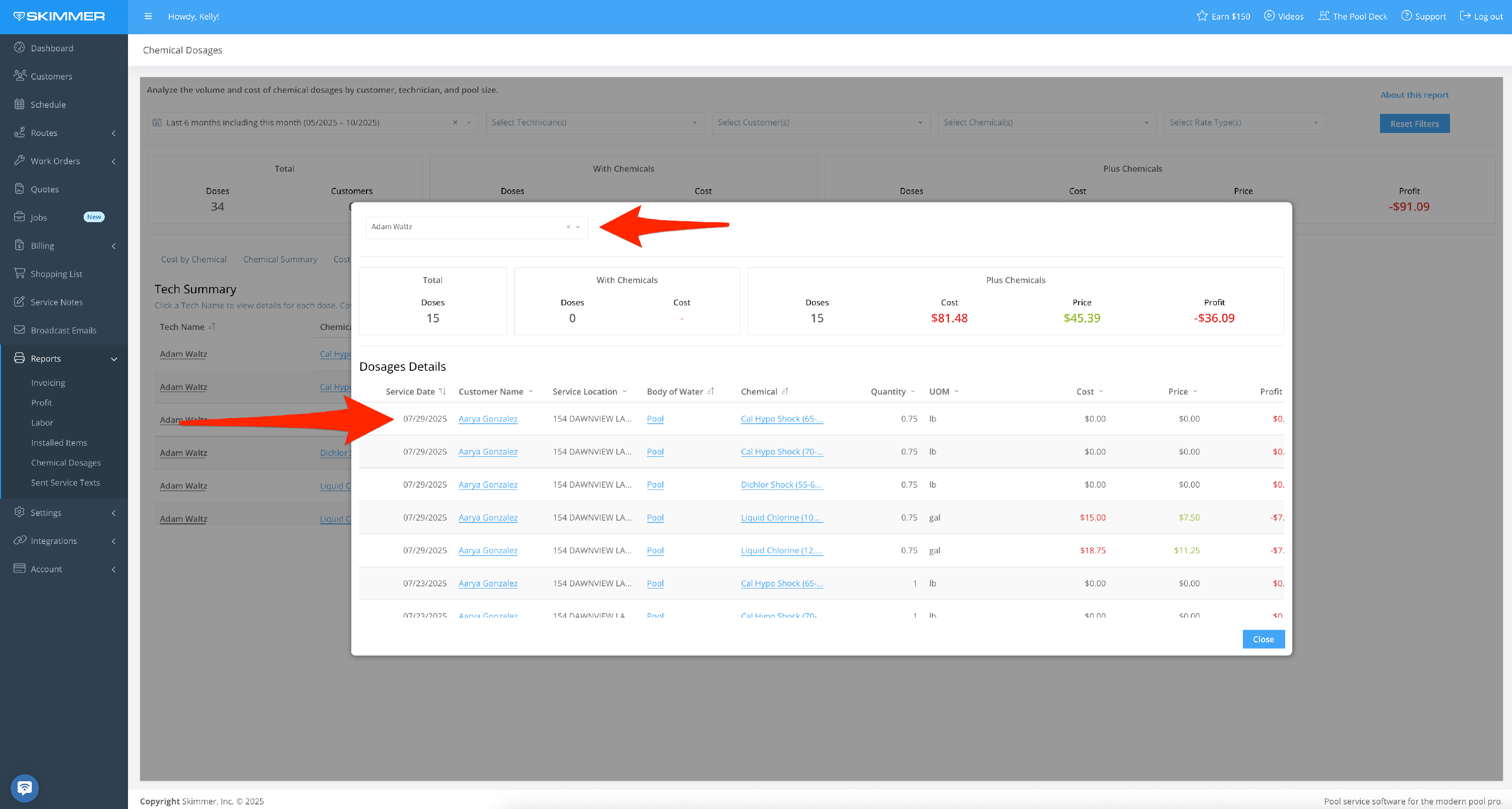 - For even more information, click on a customer’s name and the pop-up screen will show every service date, body of water, and dosage details. If they have multiple service locations, you can view them all or filter down to a selection. You can also use the Customer dropdown to switch between customers without having to exit this view.