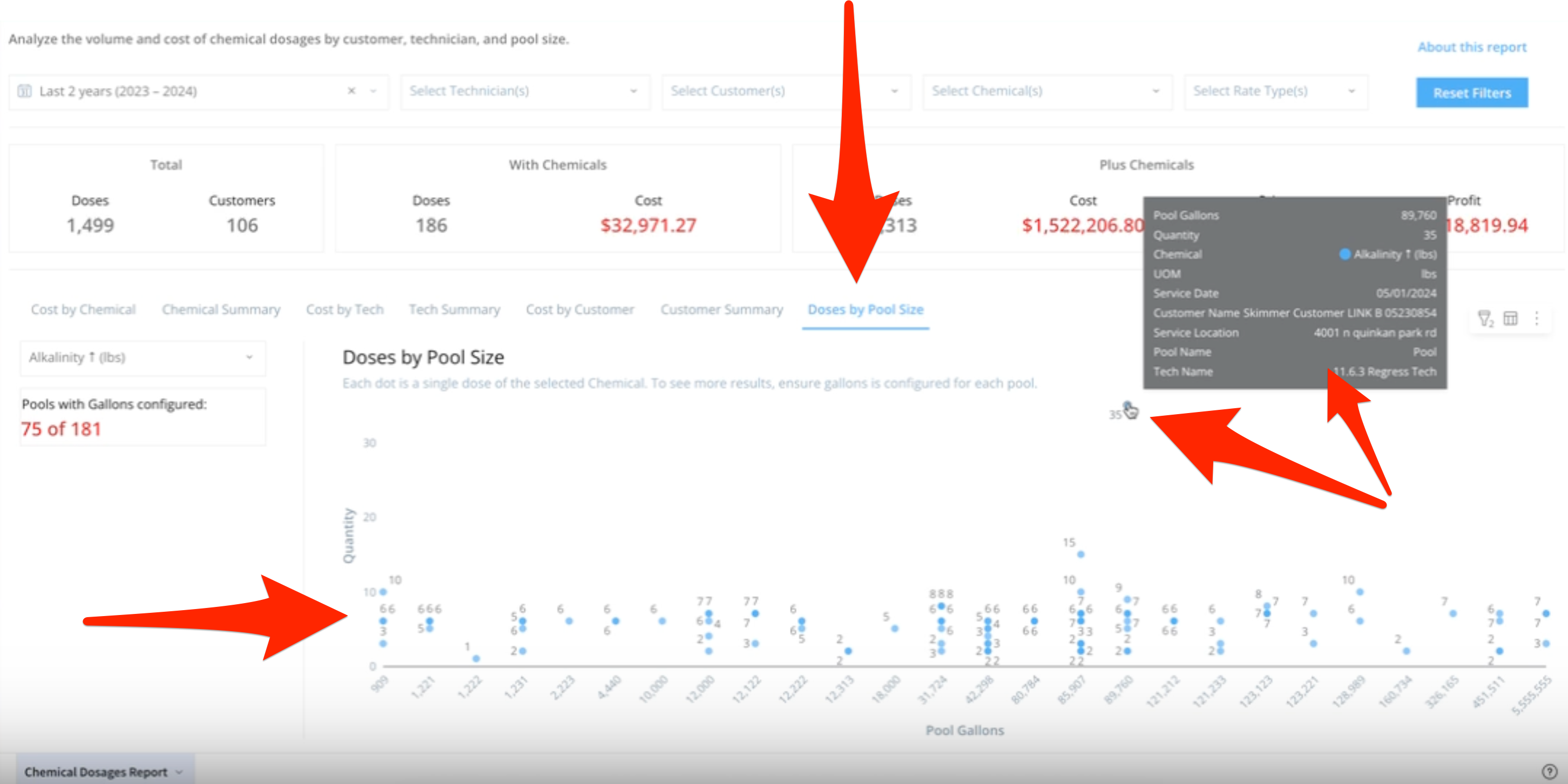 - Doses by Pool Size shows a scatter plot where each dot is a single dose of the selected chemical. The graph shows the quantity of each dose on the Y axis and pool size on the X axis. Displaying the data this way helps identify trends related to chem dosage size as it relates pool size, and it makes it easier to identify outliers and exceptions. Hover over a dot and a box will appear with data related to that dosage, such as service date, location, and tech. The more pools for which you’ve indicated gallon/size, the more data you’ll be able to see here.