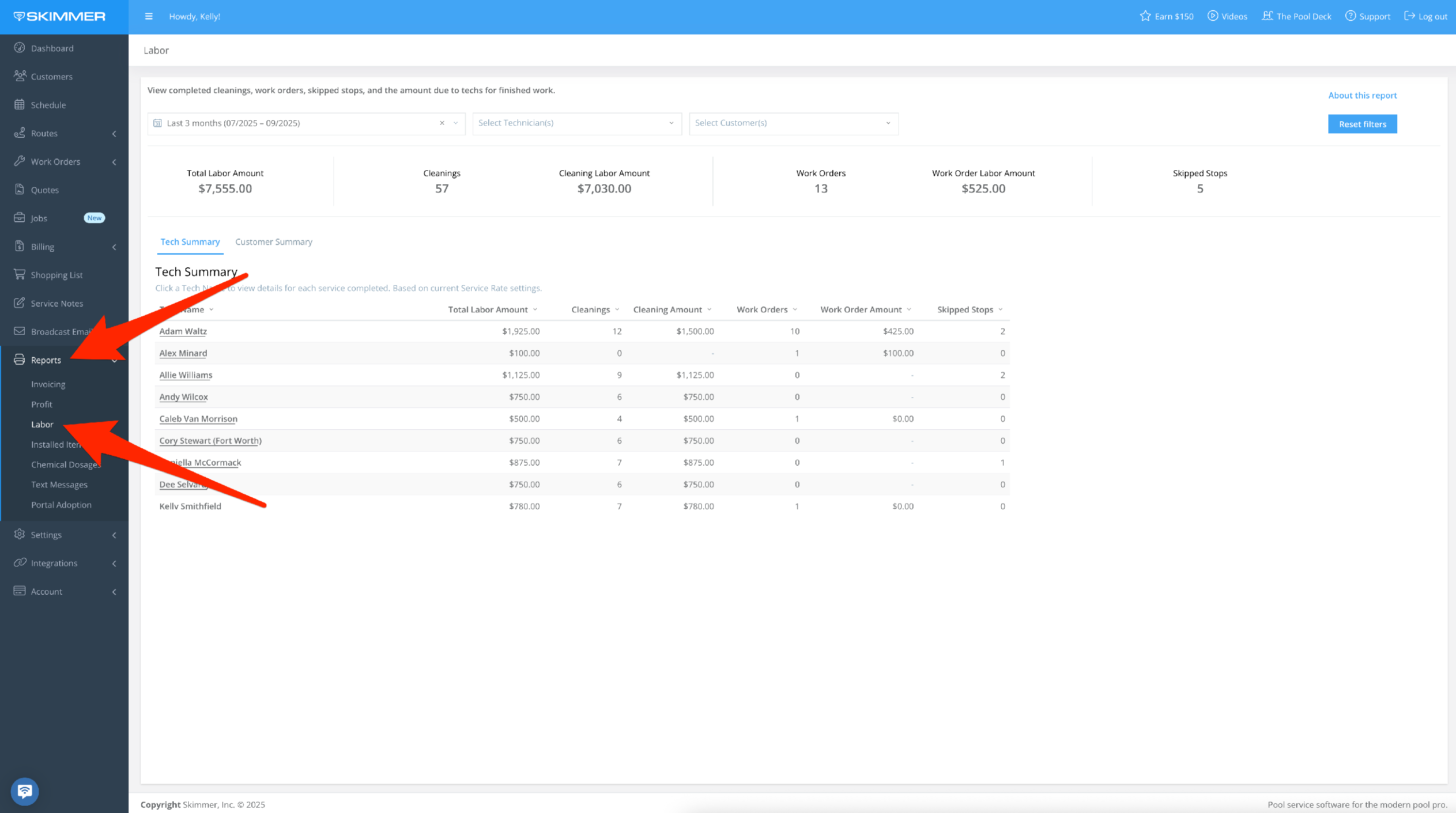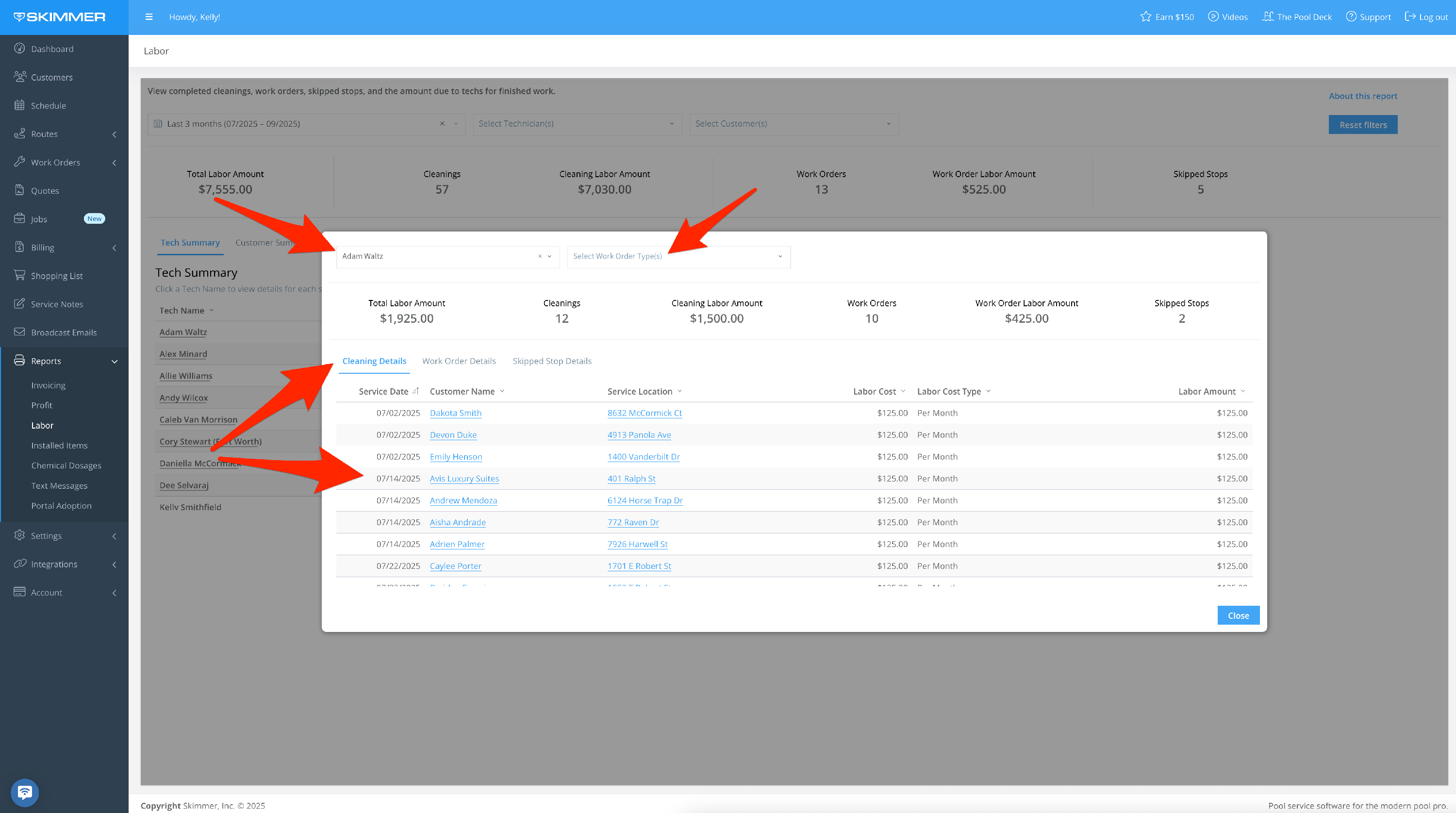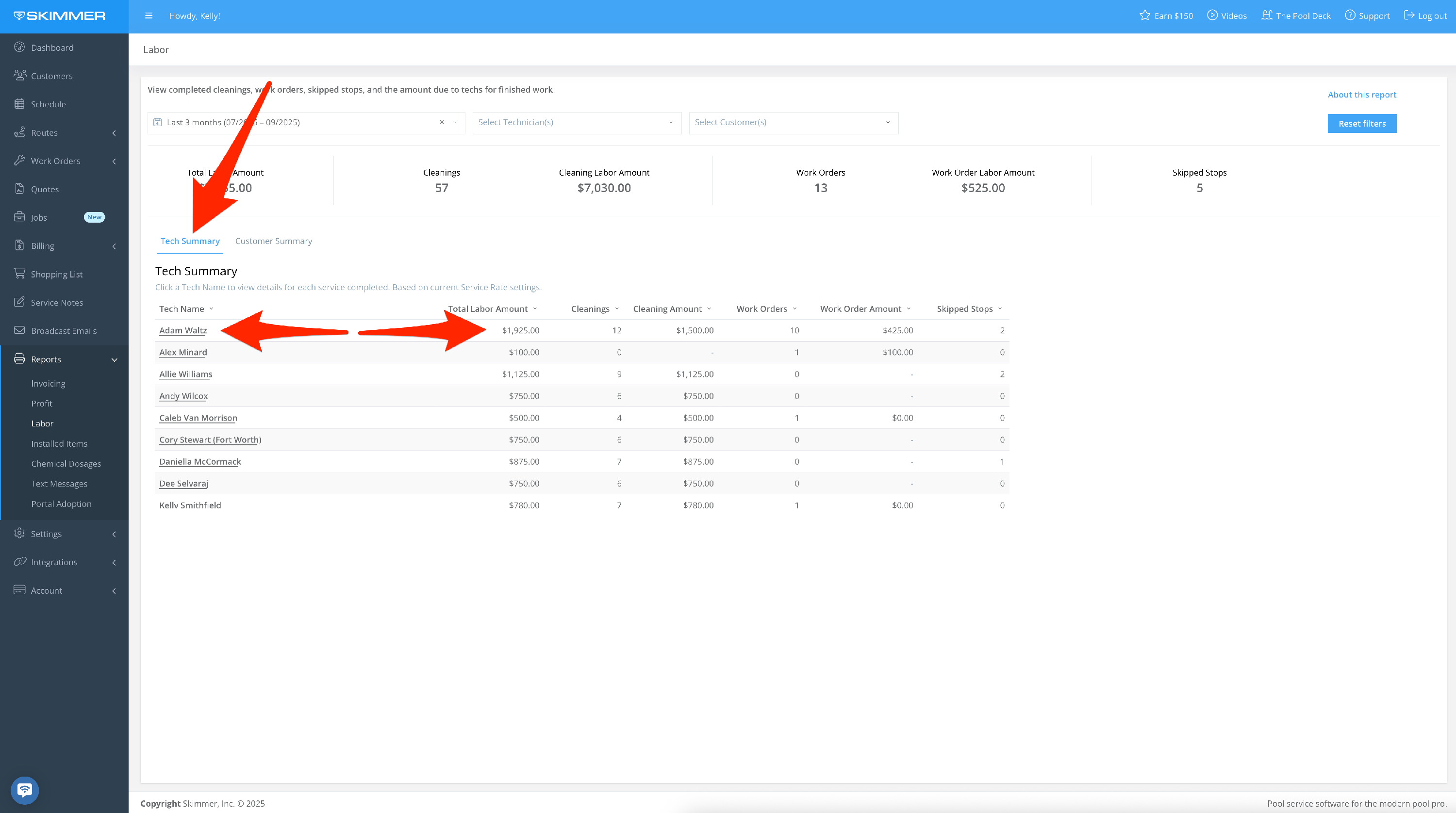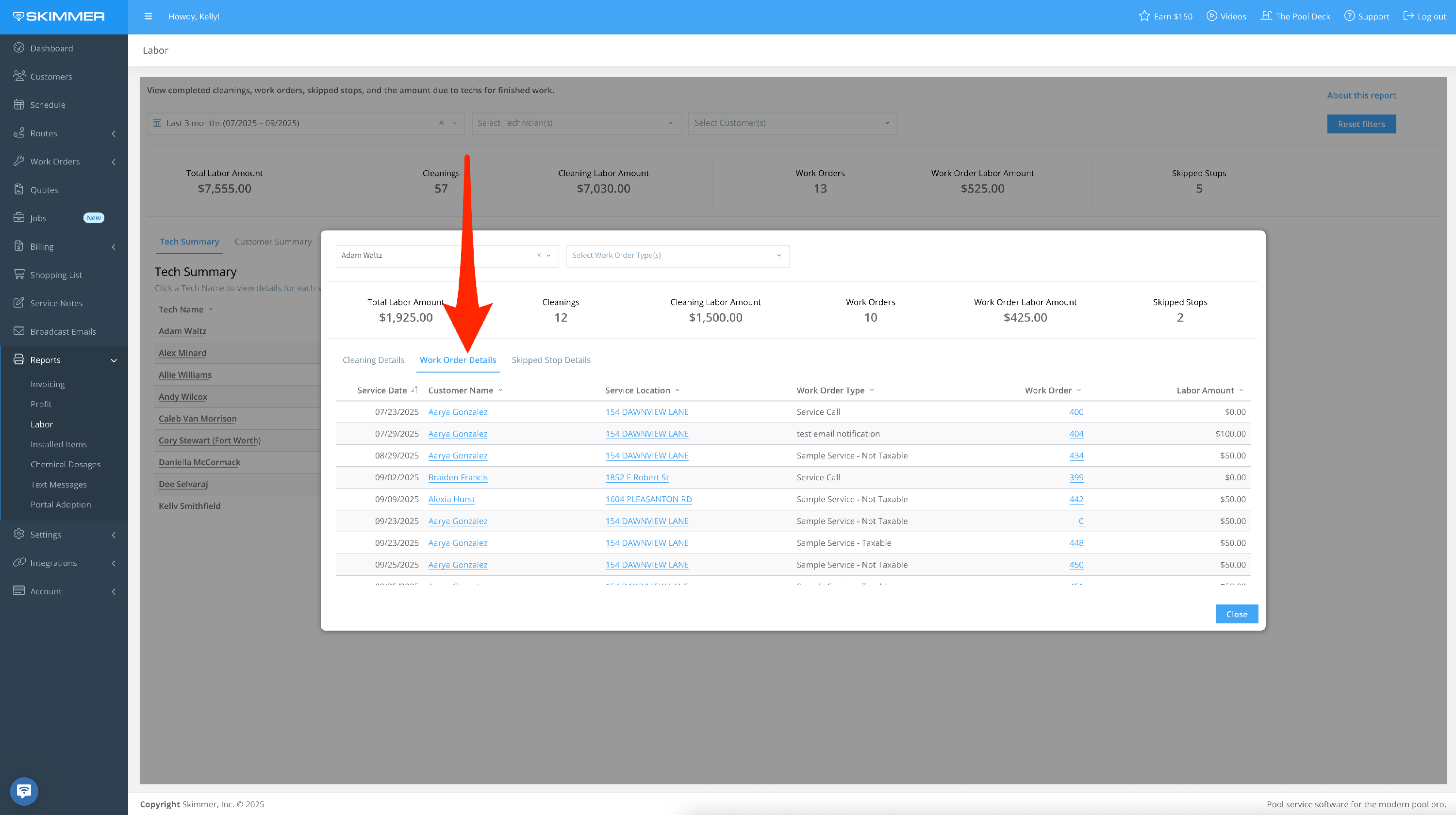 - Tech Summary also gives the full breakdown of how you arrived at your labor cost, organized by tech and job type. For even more information, click on a tech’s name and the pop-up screen will show every customer and location serviced, as well as labor cost. The information is split between tabs for completed cleanings, work orders, and skipped stops. You can use the Tech dropdown to switch between techs without having to exit this view, and the Work Order Type dropdown to select specific completed jobs.