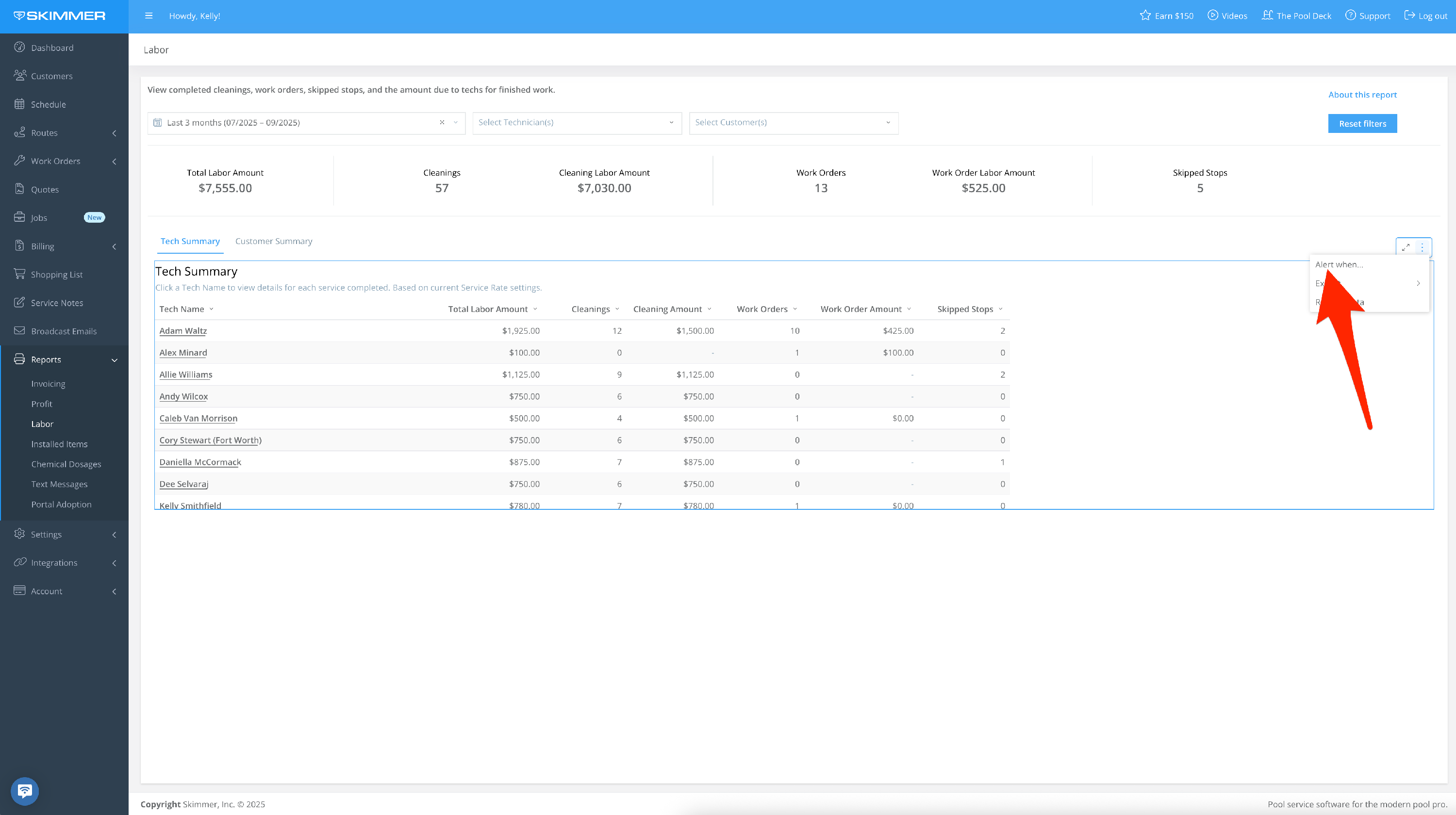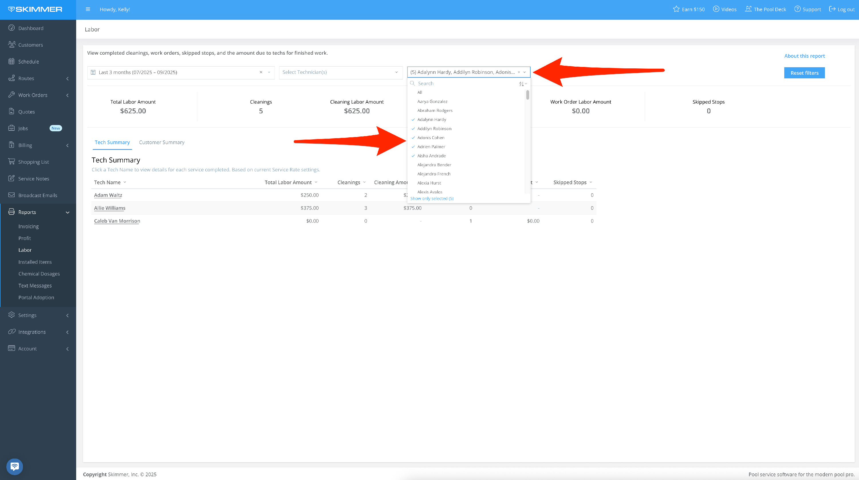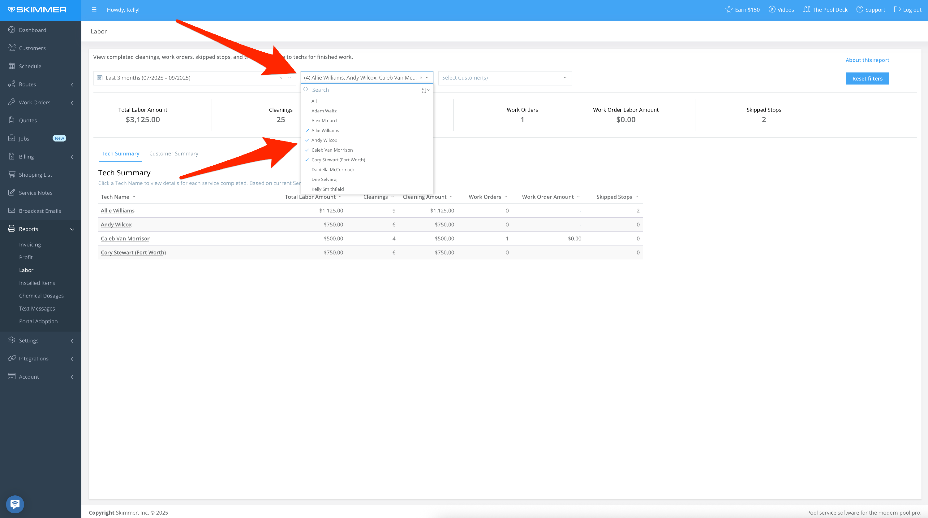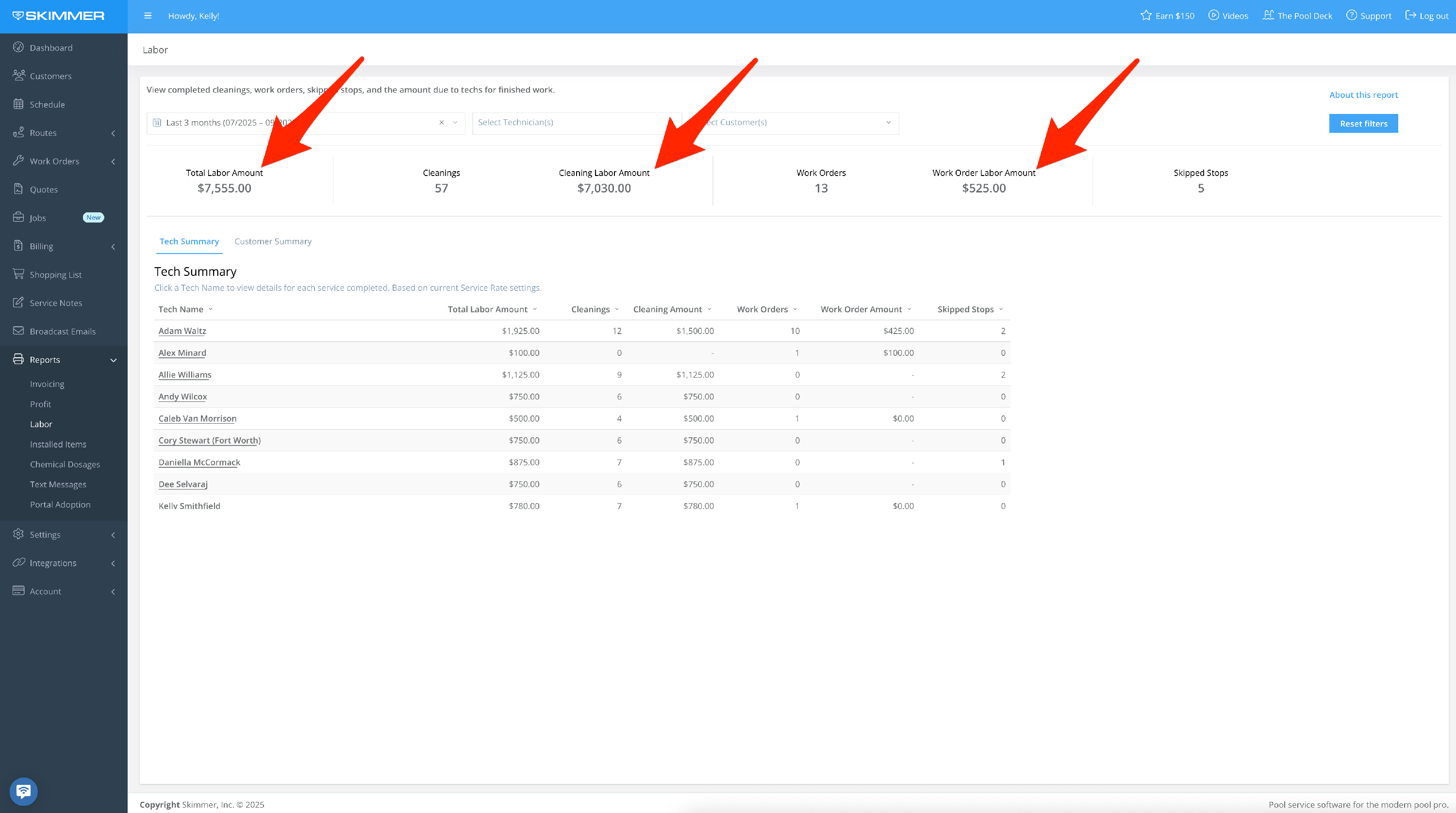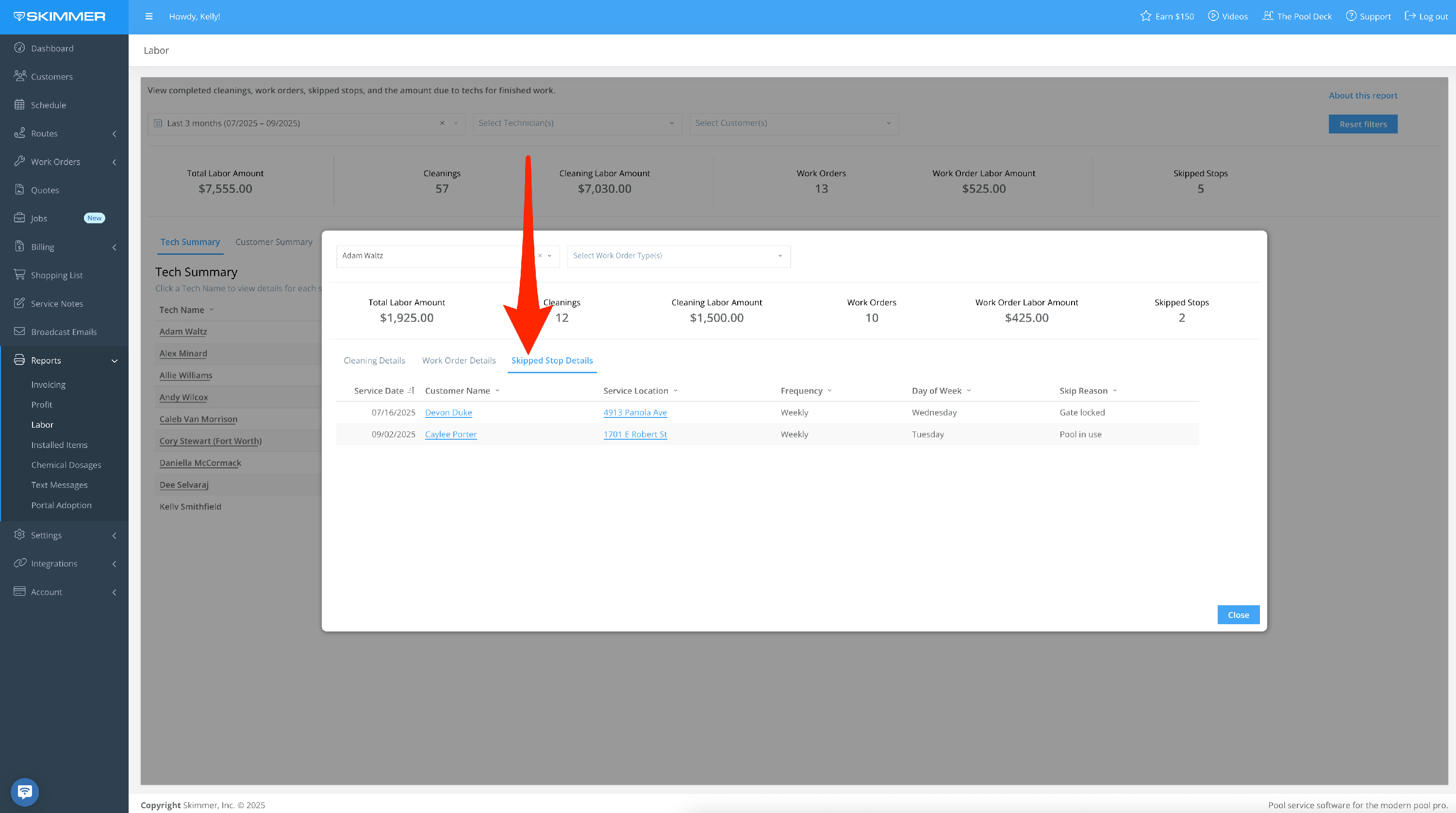 - Tech Summary also gives the full breakdown of how you arrived at your labor cost, organized by tech and job type. For even more information, click on a tech’s name and the pop-up screen will show every customer and location serviced, as well as labor cost. The information is split between tabs for completed cleanings, work orders, and skipped stops. You can use the Tech dropdown to switch between techs without having to exit this view, and the Work Order Type dropdown to select specific completed jobs.