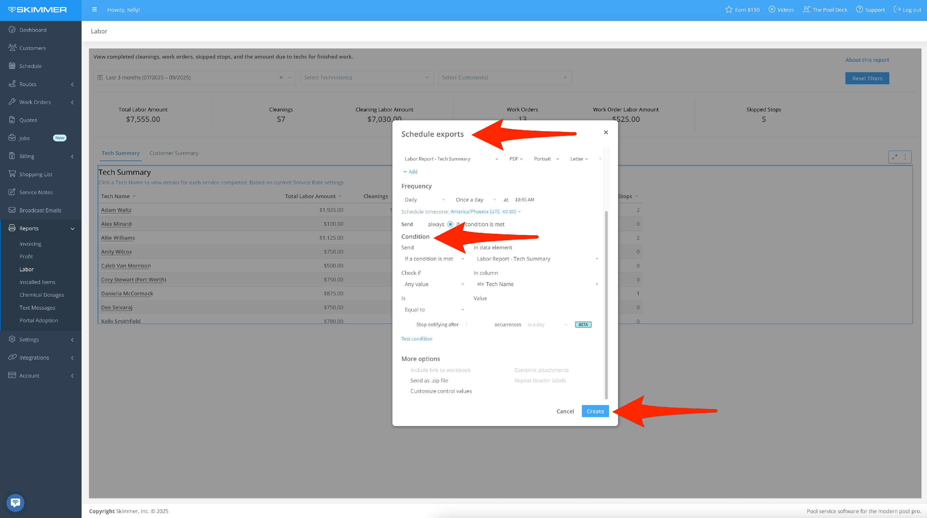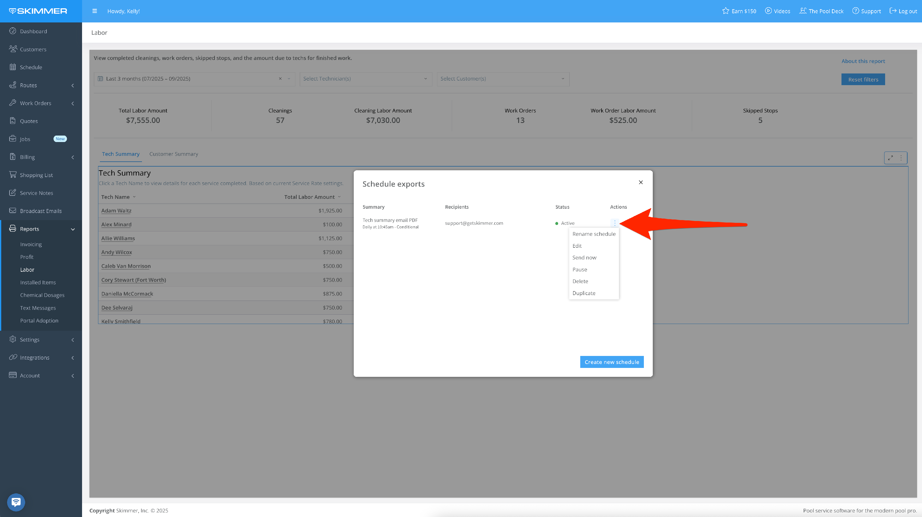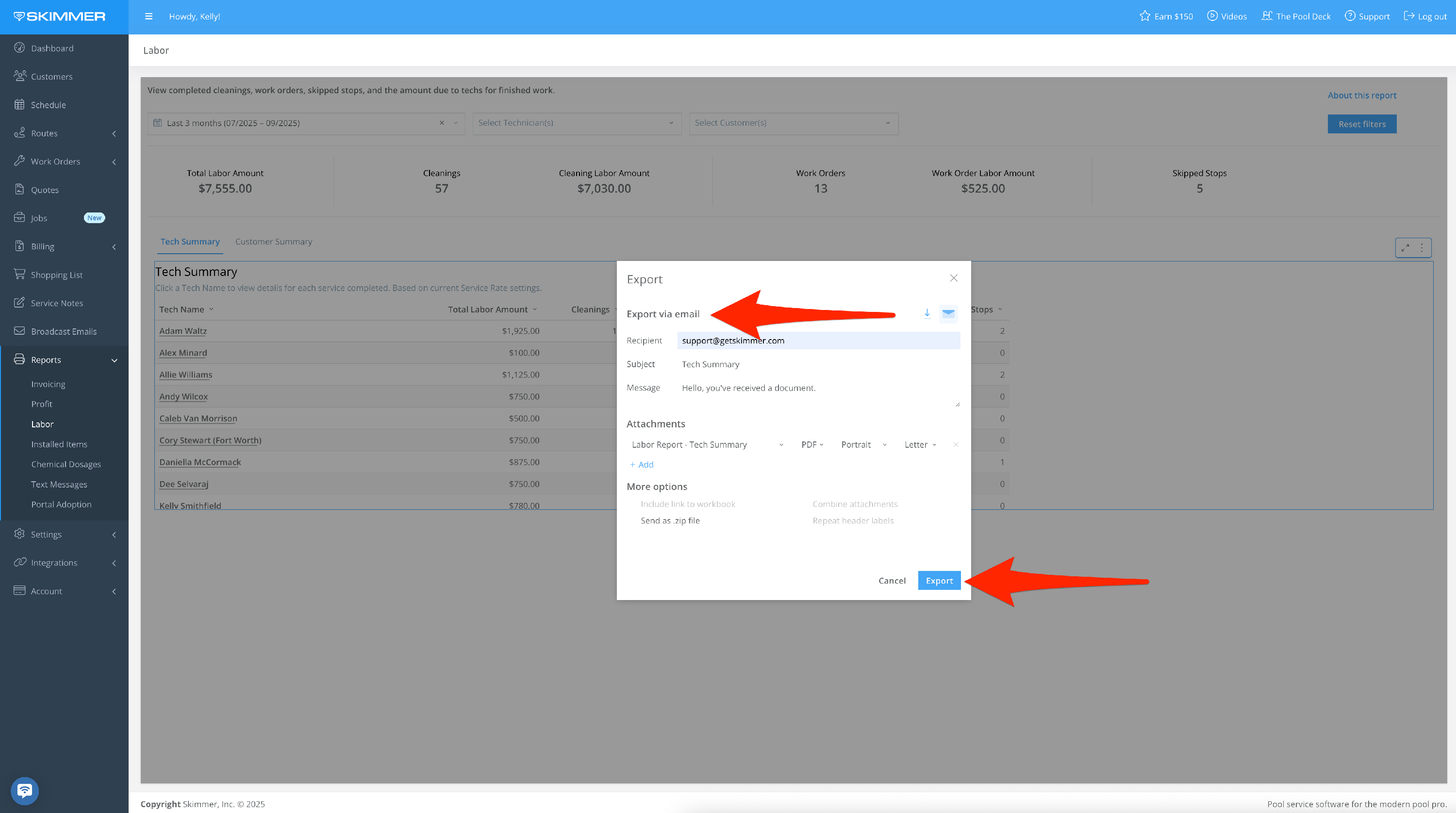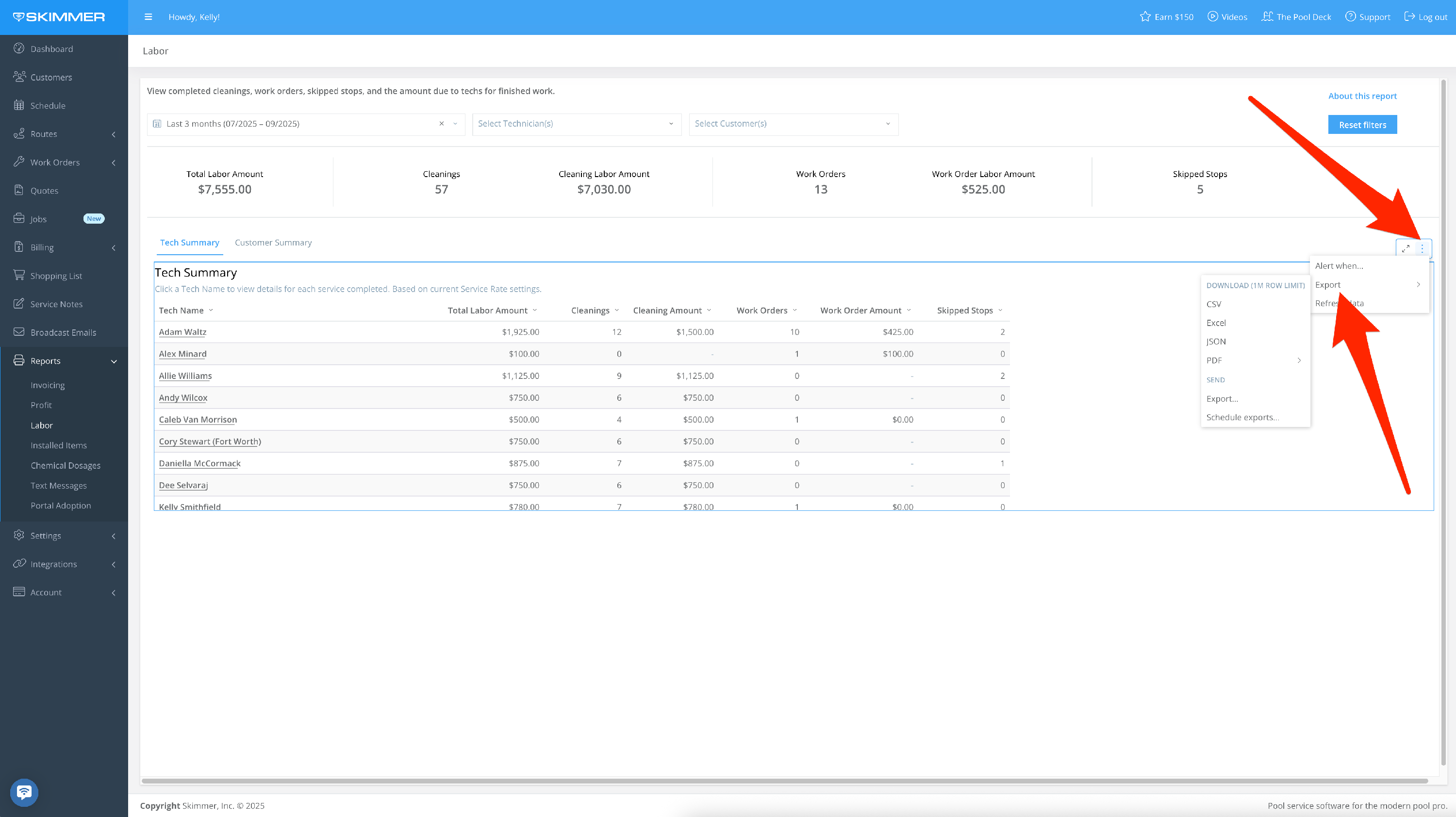 - Tech Summary also gives the full breakdown of how you arrived at your labor cost, organized by tech and job type. For even more information, click on a tech’s name and the pop-up screen will show every customer and location serviced, as well as labor cost. The information is split between tabs for completed cleanings, work orders, and skipped stops. You can use the Tech dropdown to switch between techs without having to exit this view, and the Work Order Type dropdown to select specific completed jobs.