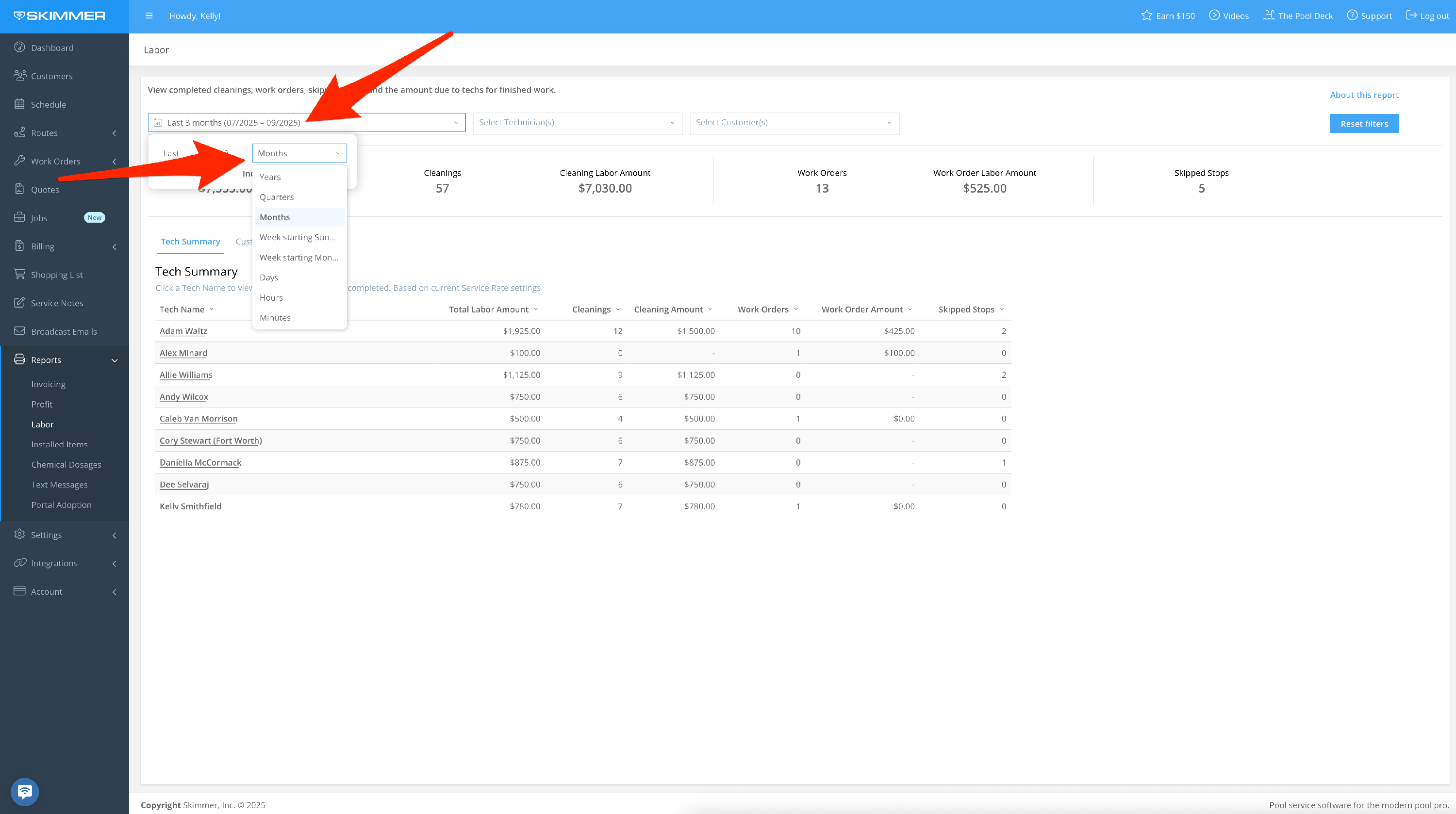 Display work completed by a specific tech, or a select set of techs. When you filter by tech, the only names that show up in the dropdown are the ones who have performed service within the selected time frame.