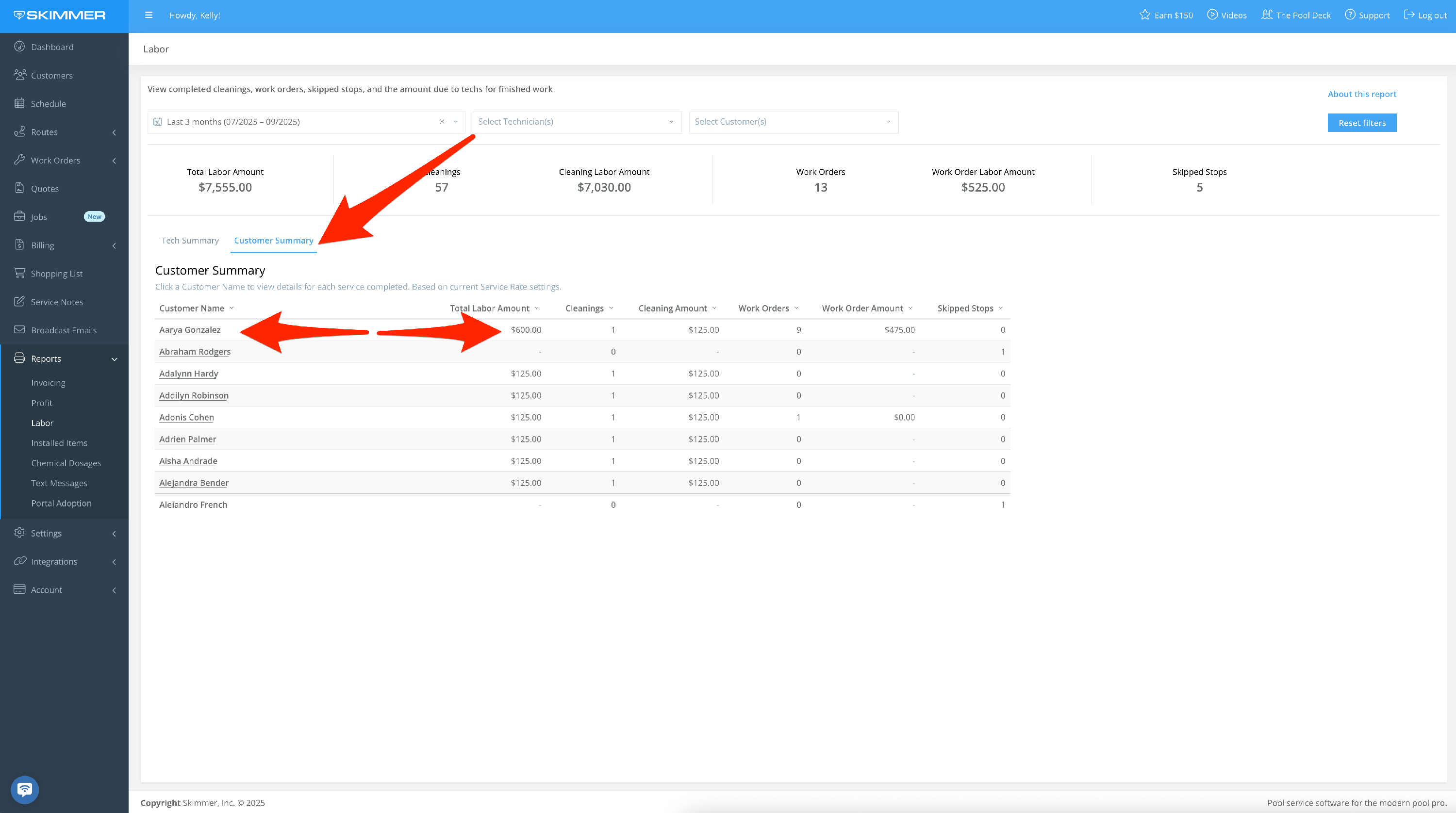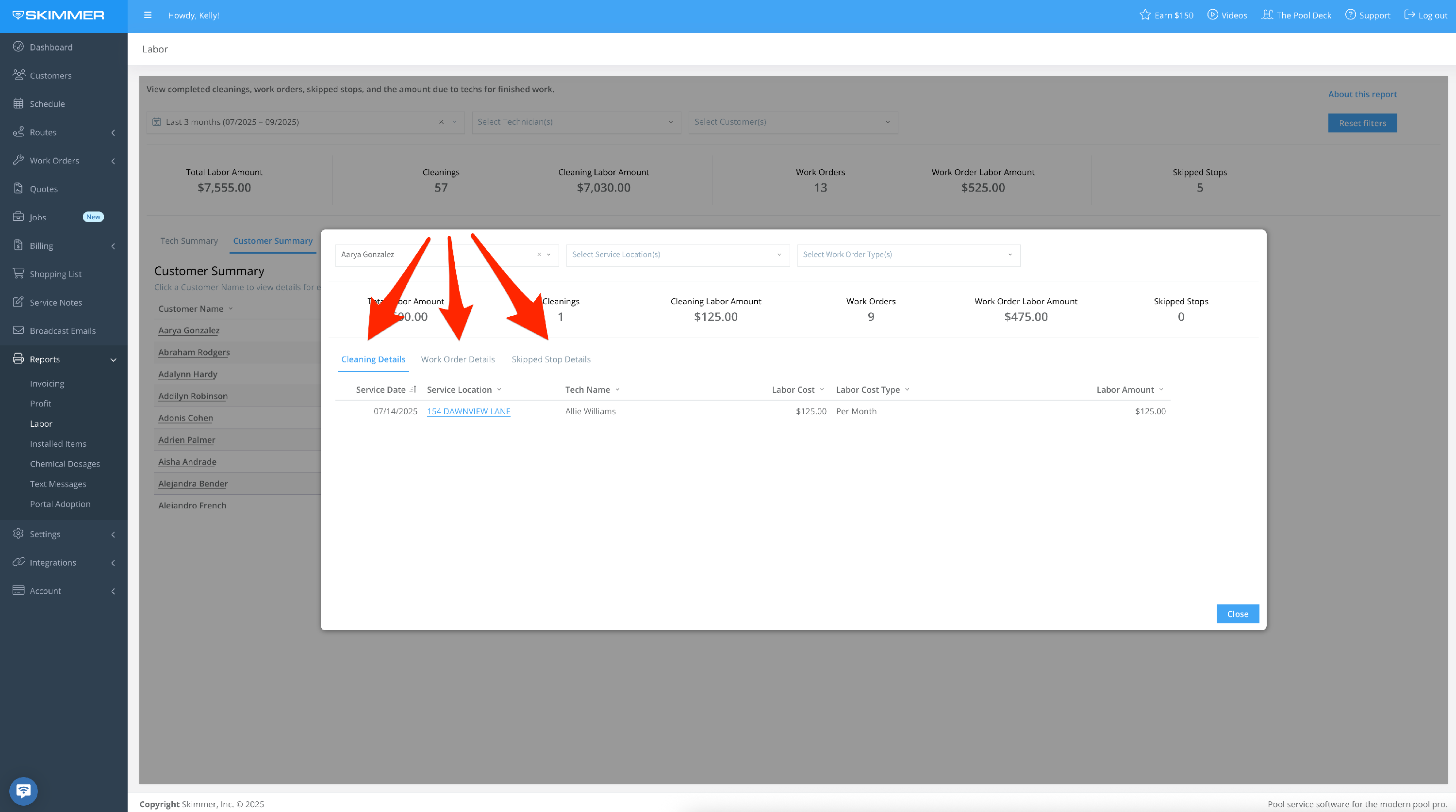 - Customer Summary gives full list of all customers serviced during your date range, along with a breakdown of labor cost for each completed cleaning or work order. For even more information, click on a customer’s name and the pop-up screen will show this data for each individual service location. The information is split between tabs for completed cleanings, work orders, and skipped stops. If they have multiple service locations, you can view them all or filter down to a selection. You can also use the Customer dropdown to switch between customers without having to exit this view.