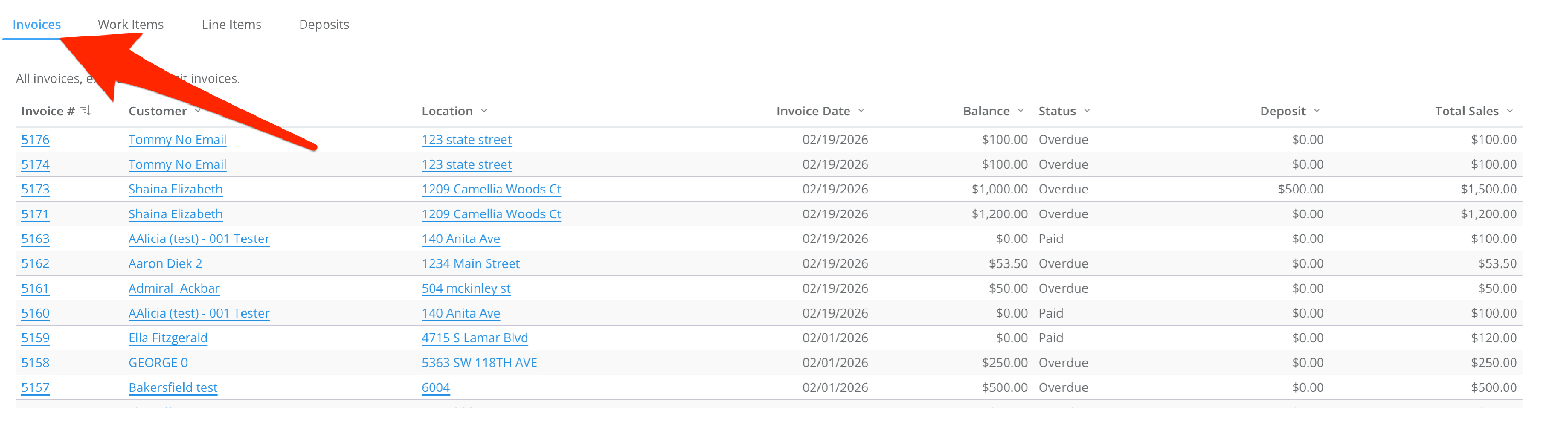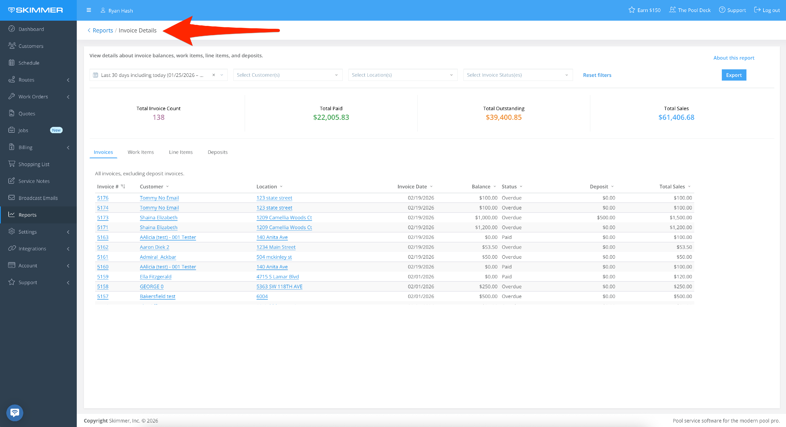 - Invoices shows invoices sent during a set date range and their basic related information, such total sales, invoice date, and service location.