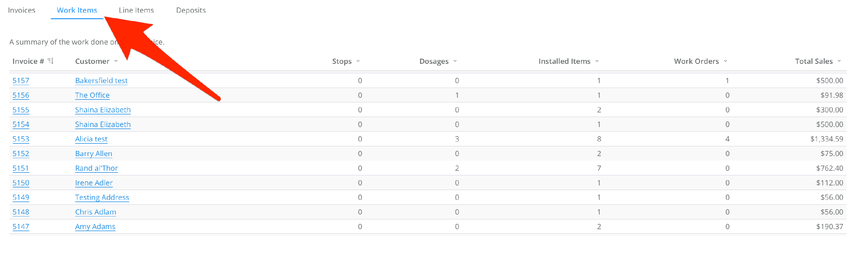 - Work Items shows a basic high-level overview of the completed work that's being charged for on invoices.