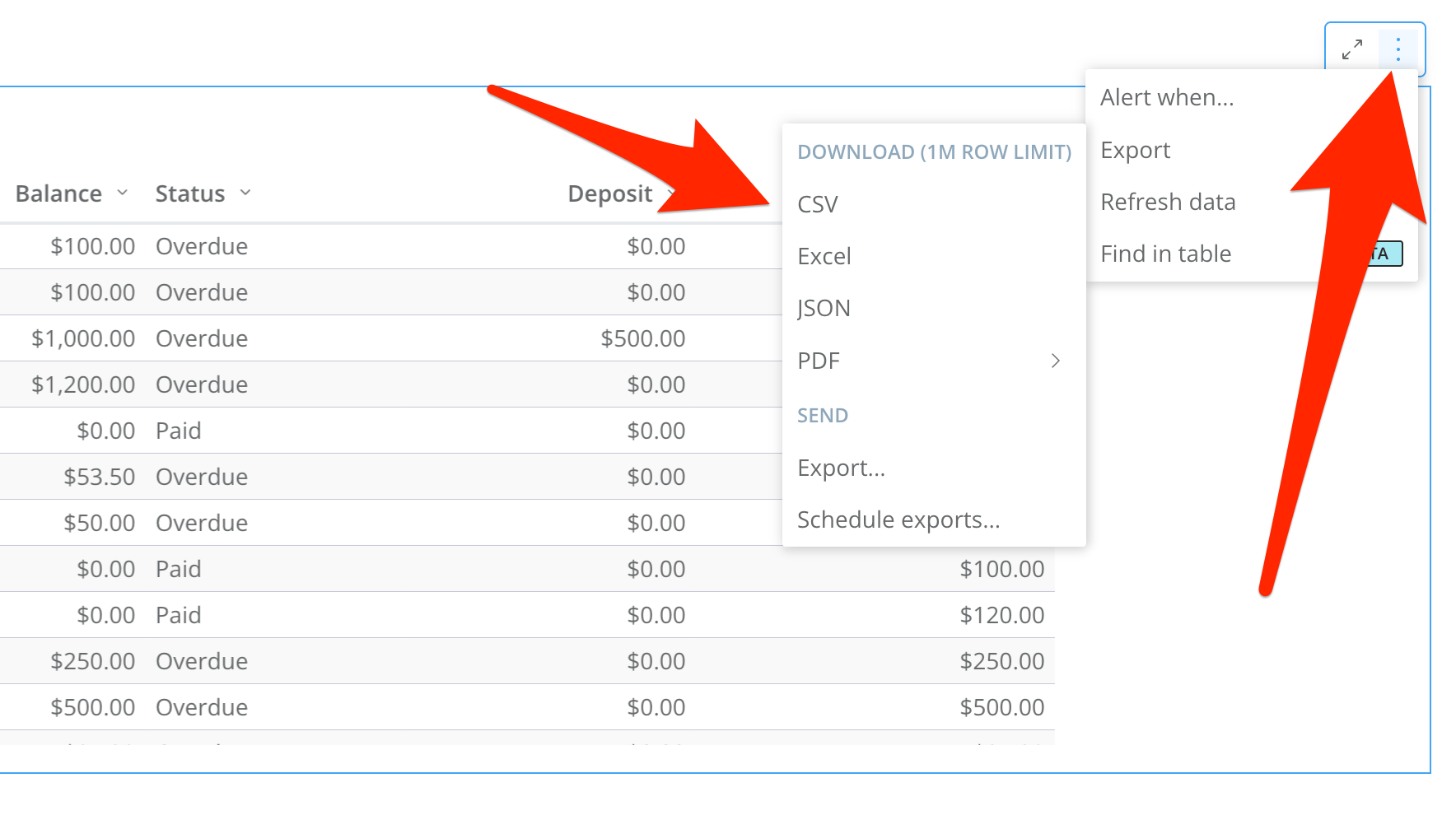 - Hover or click on a chart or table. Find the three dots that appear in the top right of the frame and click. This will give you options for working with the data in the chart you selected, including the ability to export it in various formats. This is useful if you want to view and analyze the information in your own way.