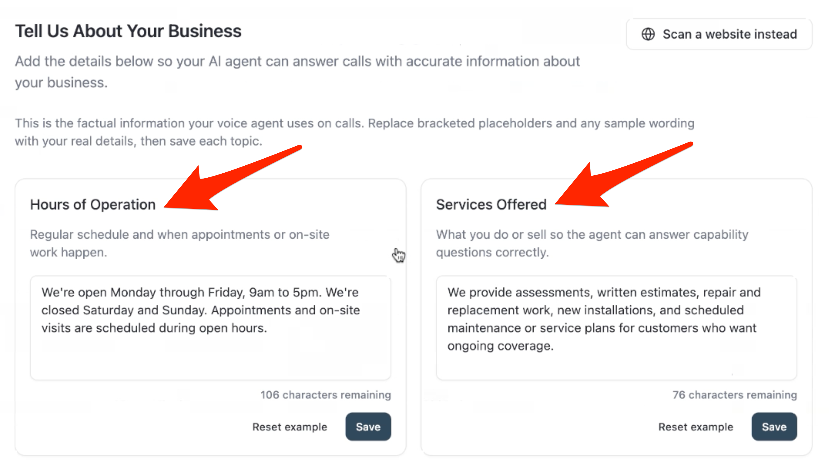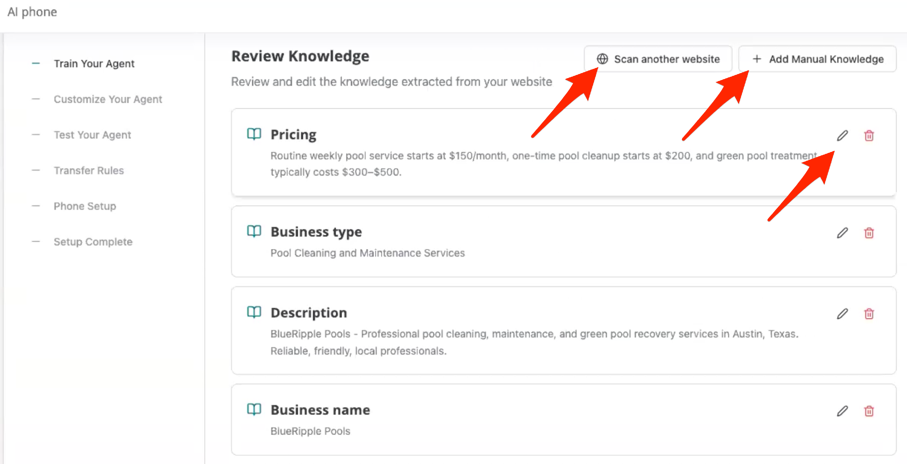 Skimmer scans your website and uses what it learns to build a knowledge base for your AI phone. It will learn things like service areas, types of service, locations, names, phones, emails, and contacts. This can take a few minutes based on the volume of information on your site. When the scan is complete, the Review Knowledge page displays the information learned from your website.