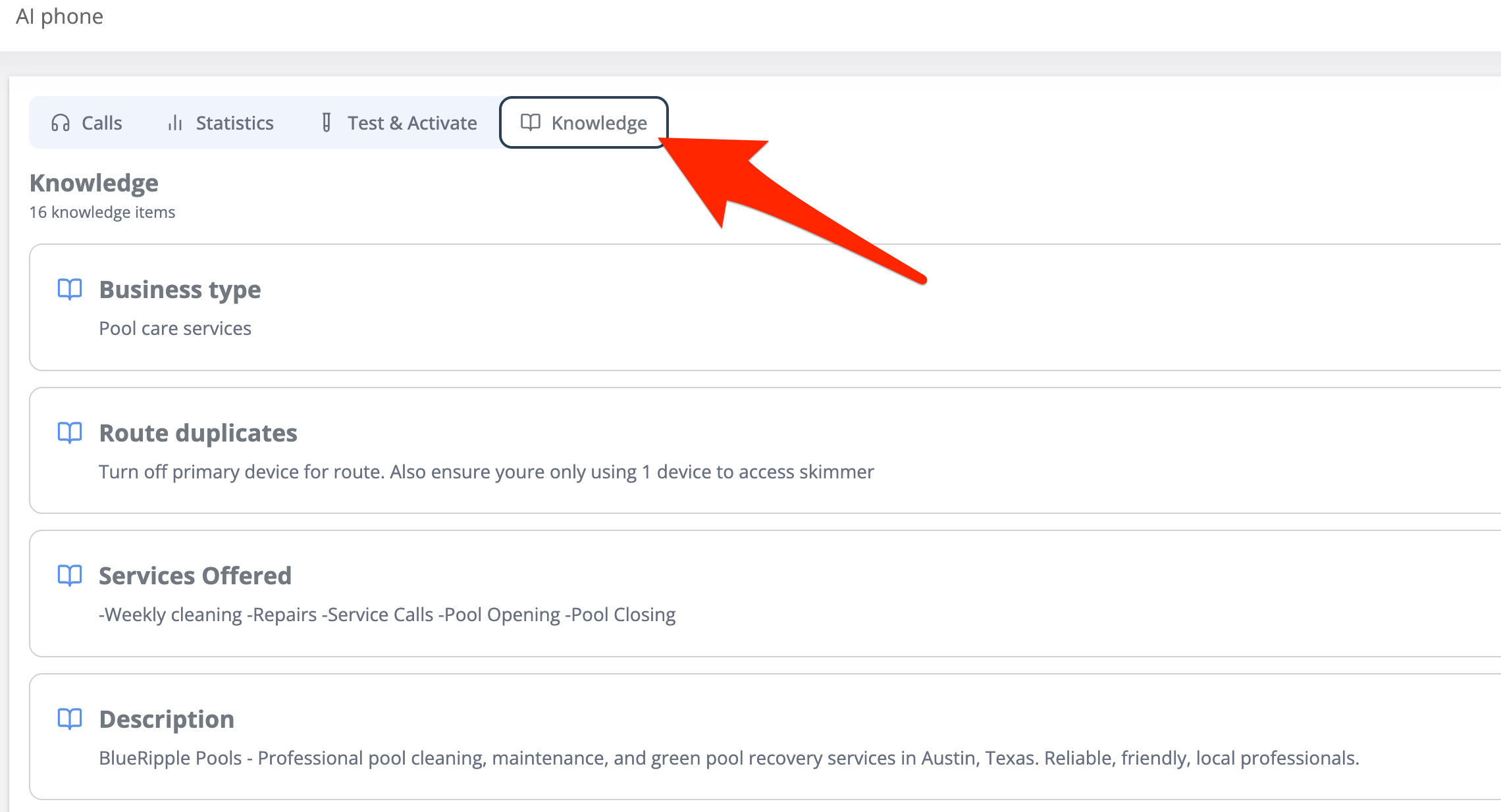 - Use the Knowledge tab under AI Phone to update this information anytime.