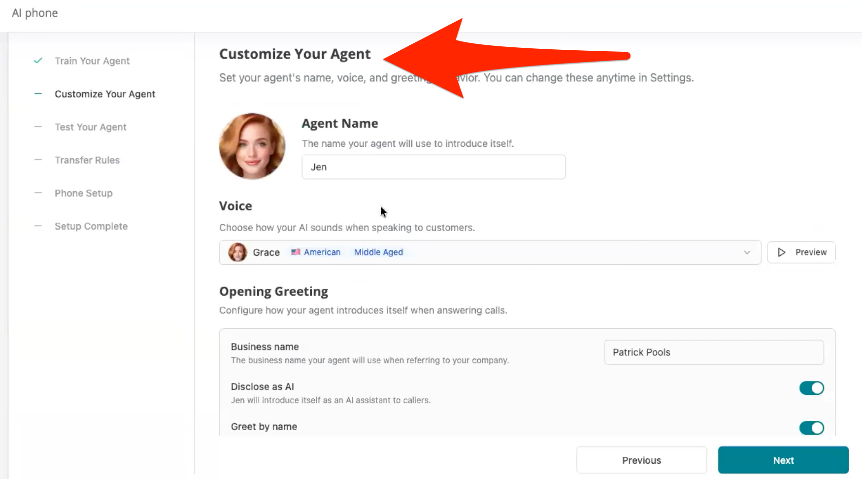 The Customize Your Agent page allows you to name your agent, select its voice, and customize the agent's greeting. You can change the agent's name, instruct the AI to include your business name, greet your clients by name, and if you wish it can identify itself as an AI agent.
