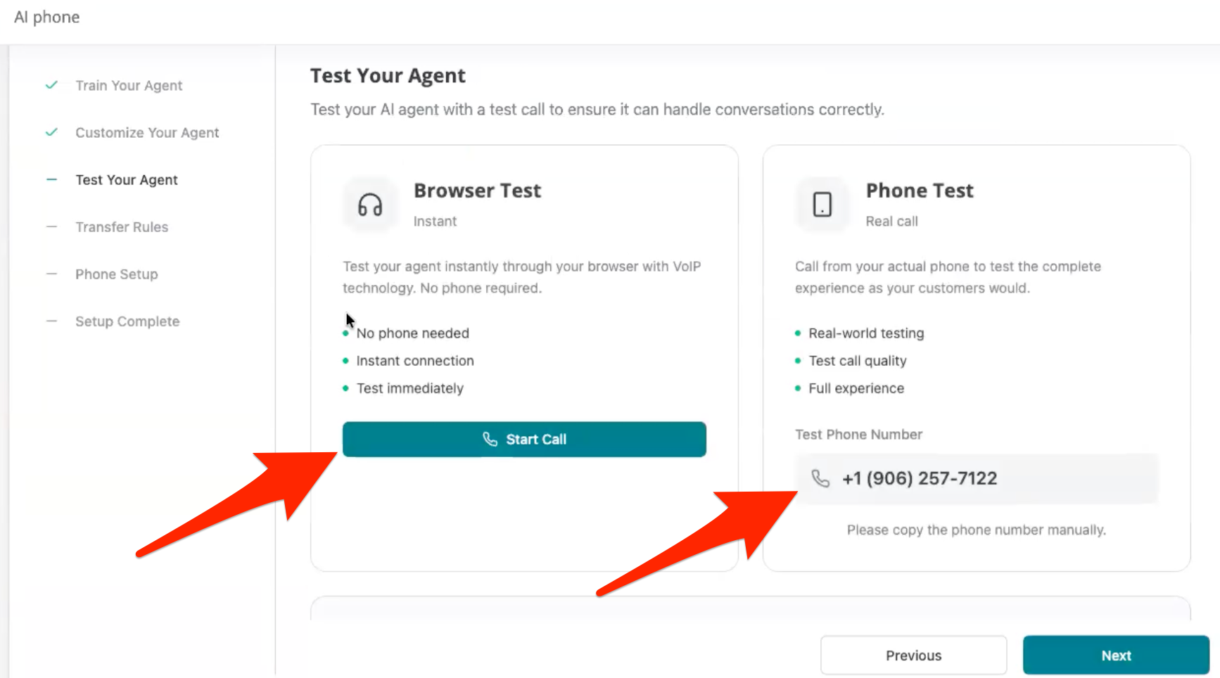 Click Next. On the following screen, you can test out your AI agent. The browser test option has limited functionality but does allow you to hear what AI Phone sounds like. The phone test option more closely mirrors a real-world call interaction. When you're finished testing, click Next to set up transfer rules.