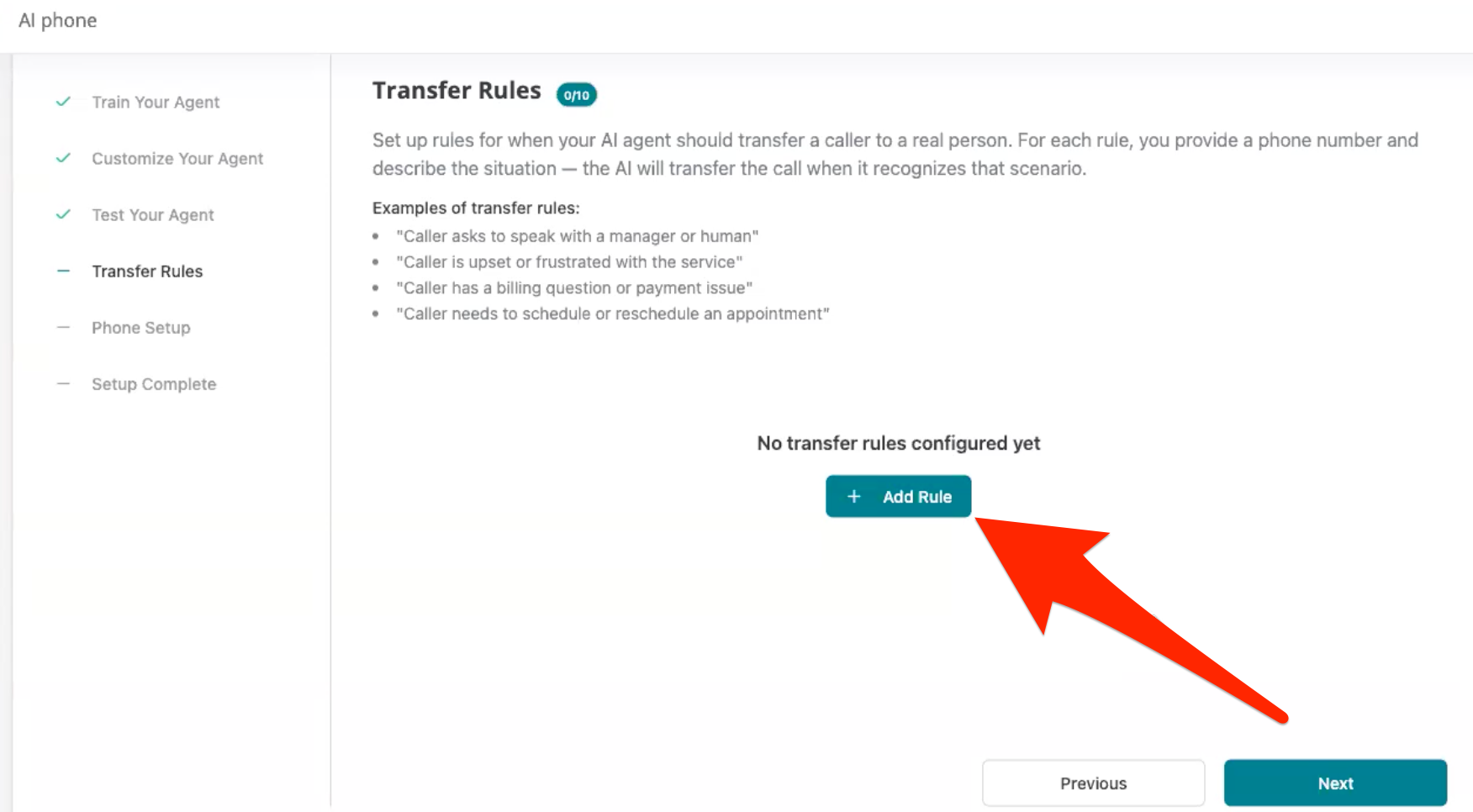 The Transfer Rules page lets you determine handoff rules for AI Phone, which decides who the AI agent will refer the call to. For example, if your caller asks for a manager, transfer them to your office manager, and if the caller has a billing question, transfer them to accounts payable. For each handoff scenario, you need a transfer rule, which you can create by clicking Add Rule.
