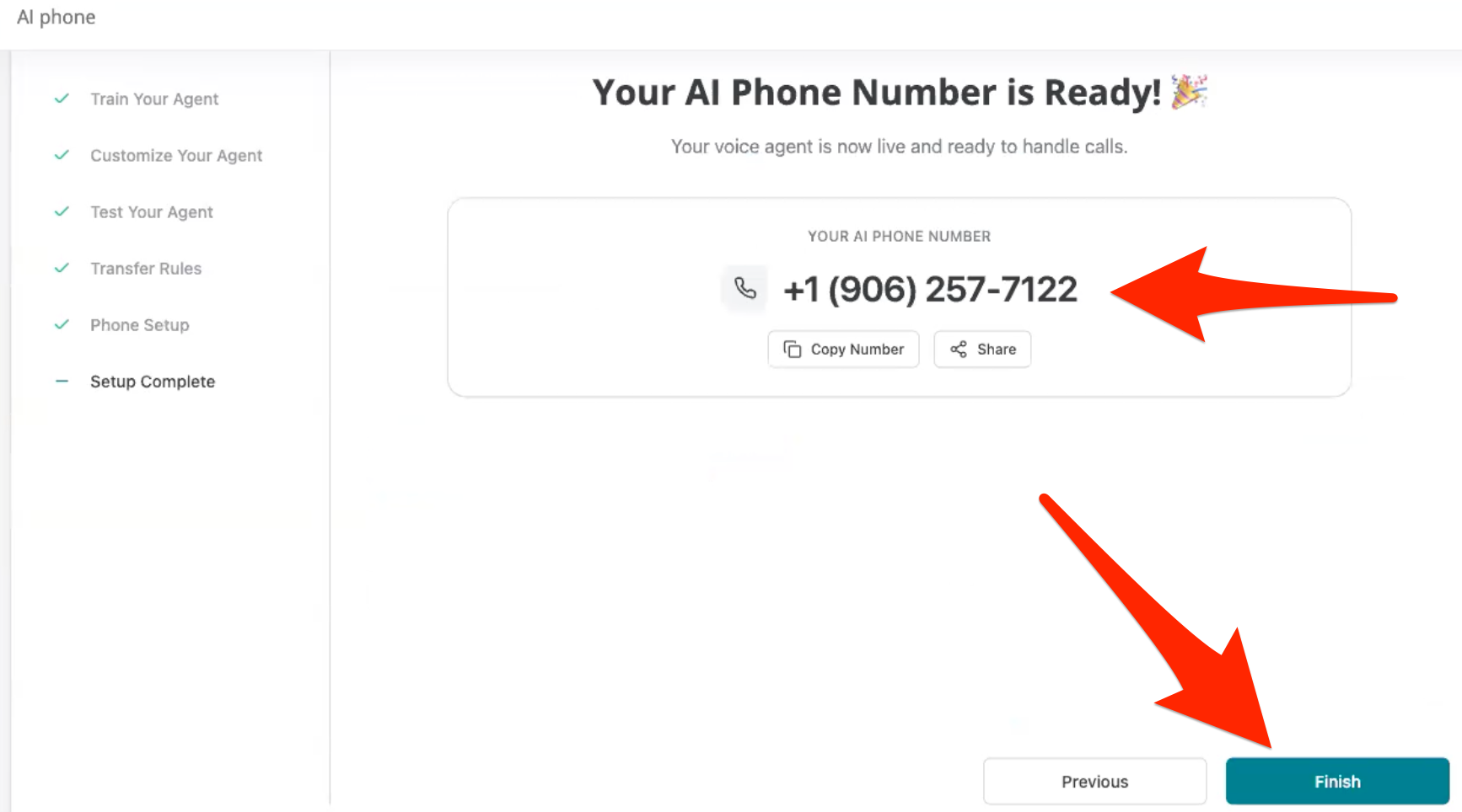 When you click Next, you'll advance to the final setup page, which displays your new AI Phone number. Click Finish to complete the setup process. You can always return to update your settings.