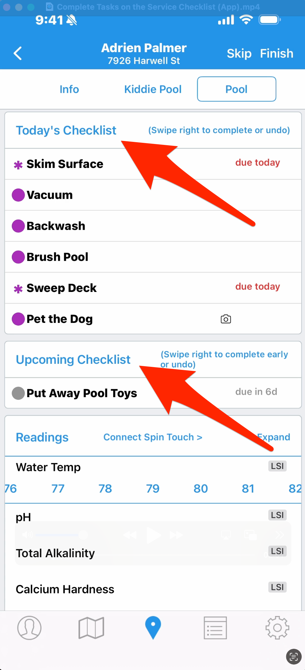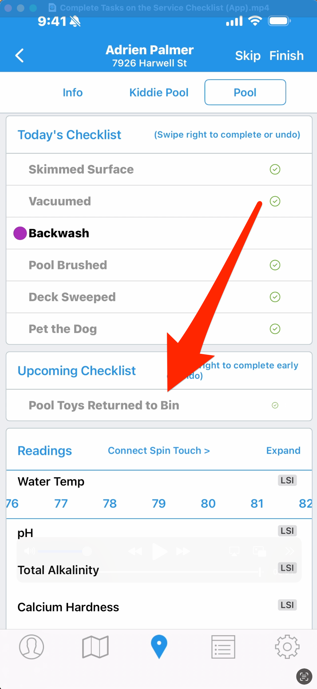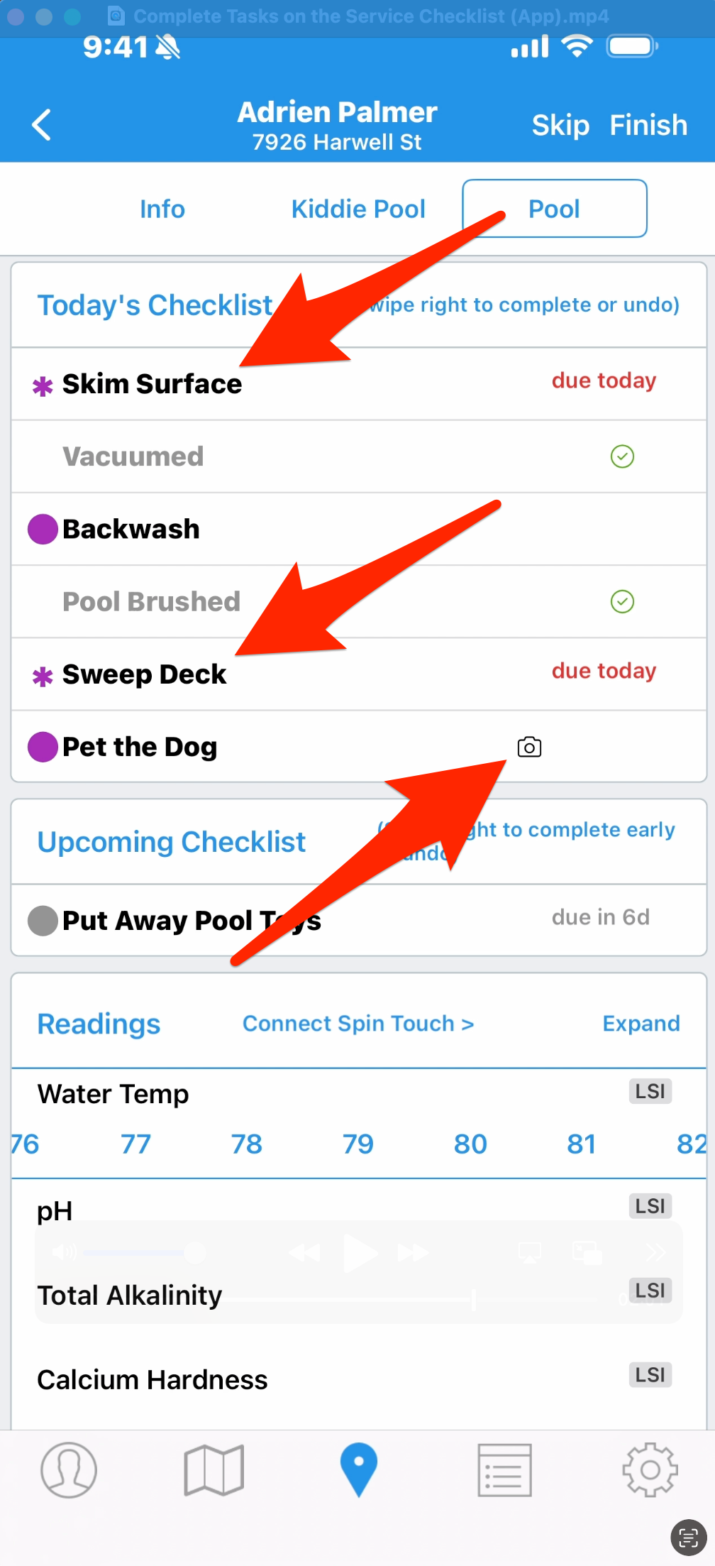 Skimmer gives you customizable tasks that you can mark as completed on the route stop. You can customize both the universal service checklist, and individual checklist items for specific pools. We show you how to do that in another tutorial. Here, we’ll show you how to mark a task as complete, and how to satisfy additional criteria.
