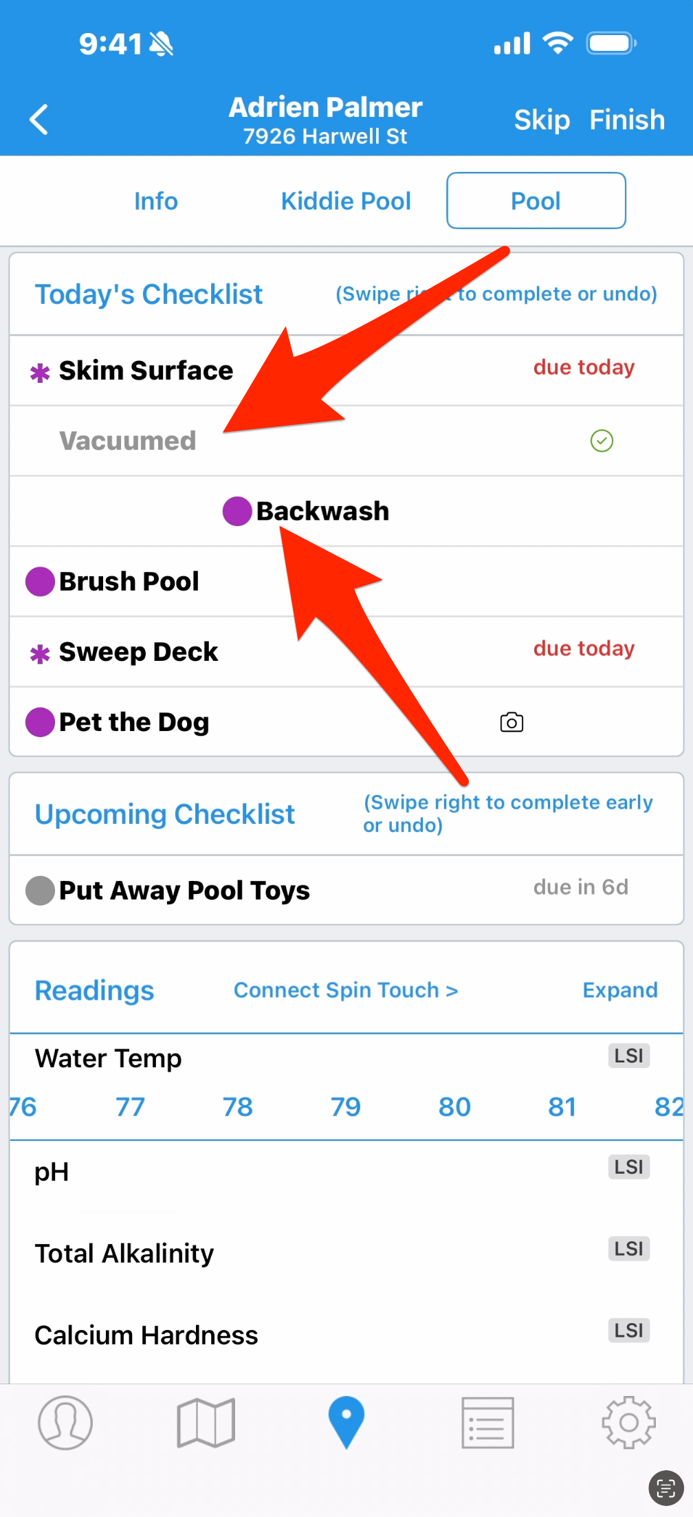 Vacuum, Backwash, and Brush Pool are standard tasks that will be on the list for each service, and the tech can choose whether to mark them as completed. To complete them, swipe right, and the item will get a check mark and turn gray. Swipe right again to take it back. When completed, the description changes to what you chose during setup, and that will be sent to the customer if you include the checklist in the service email.