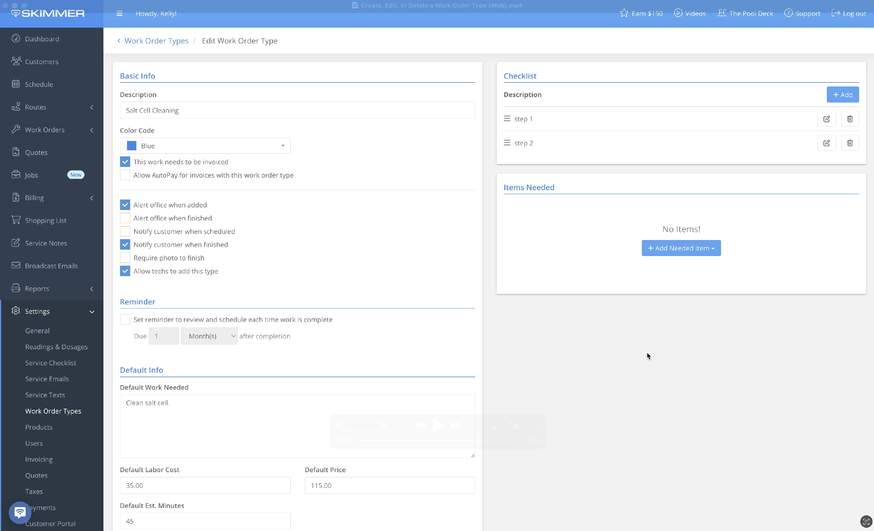 Choose how you want the completed work to appear on the invoices that Skimmer generates. Line Item Name will appear on the list of what’s being charged for, which you can leave blank if you just want to use the name of the work order type. Description will give the customer basic information about the completed job. If you want to include the exact date of service on the invoice, select that. You can also choose to use the default price, and set whether the price is taxable.