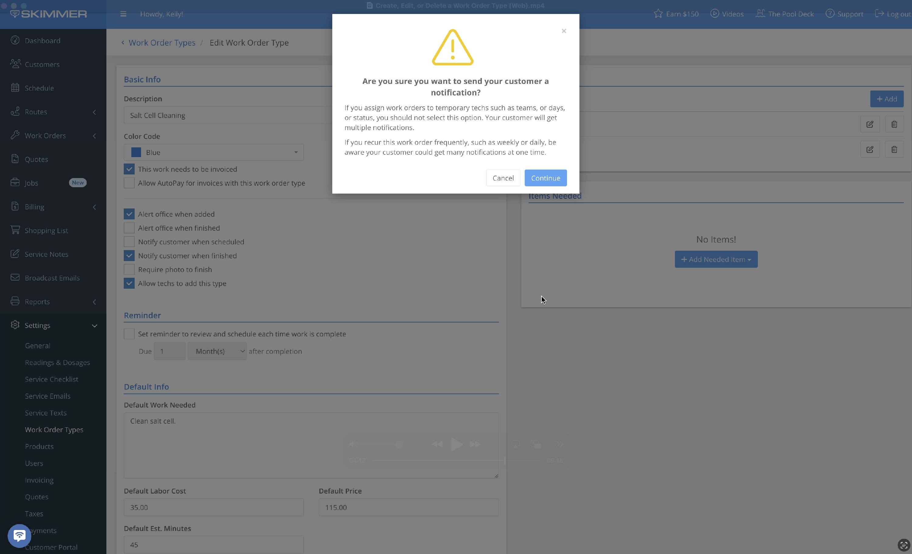 An alert will ask if you’re sure. If you schedule work orders for a temporary tech or day as a placeholder, and then move them to the real assignment later, we don’t recommend using this because the customer will get multiple alerts. Also, if it will recur frequently, Skimmer populates ninety days’ worth of recurring work orders into the future, so this may result in them getting lots of notifications all at the same time. If neither applies and you want to continue, go ahead and click, and the option will activate.