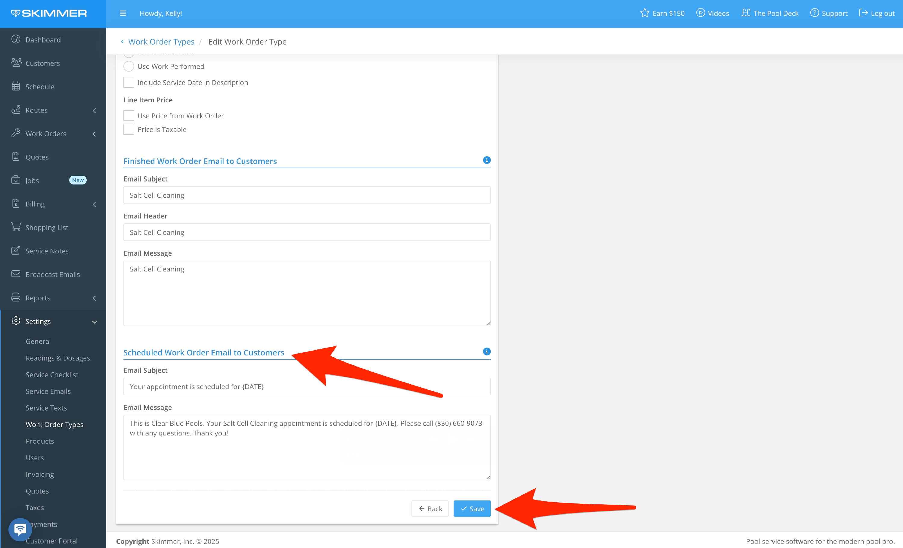 Scroll down and find the box for the scheduled work order email alert. By default, it gives the appointment date, the work order type, and your company name and contact info. You can edit whatever you like. When ready, click Save.